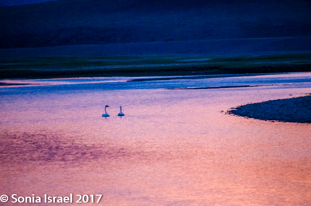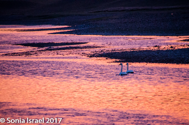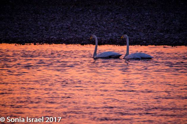 But we made it. Tripods were set up and the clicking began as the sun peeked out over the horizon. Two swans were floating in the water as the sun rose, as if posing just for us. The water turned from a dark blue, almost black, to pink and orange and then red.