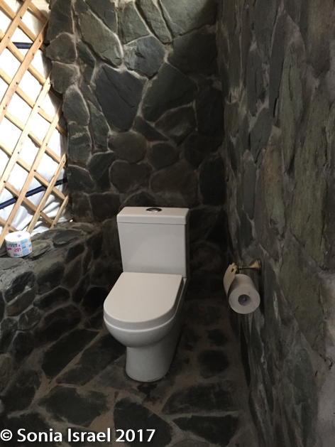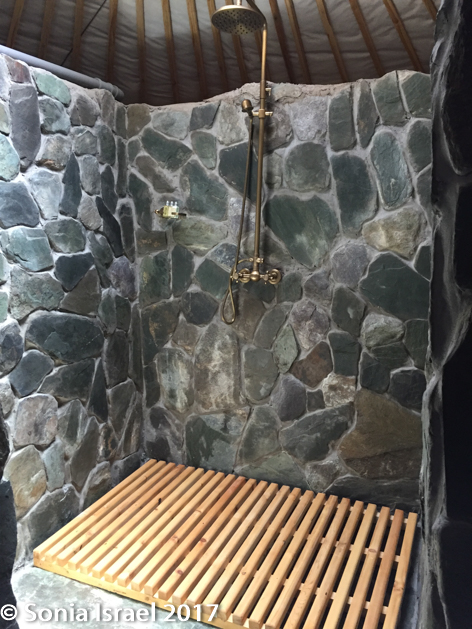 Andy and I entered our ger and just stood there in amazement. It was a traditional Mongolian felt ger, but much more luxurious. And there was a second ger attached to the first. The main ger had a large double bed, the ever present stove for heat (which we did not need), two comfortable chairs, a red saddle and other pieces of art that Jalsa has collected over the years. And electricity and outlets!  The second, attached ger was our bathroom, with a stone floor, stone shower, stone wall partitions and plenty of hot water. We did need to be mindful of water usage, but still, it was a lovely shower. There were slippers and robes and of course shampoo and soap (remember at the other ger camps we had to have our own soap). And in keeping with Mongolian tradition, each ger has a southward-facing entrance, so we could look out at the unobstructed views of the desert and the Gobi-Altai Mountains.