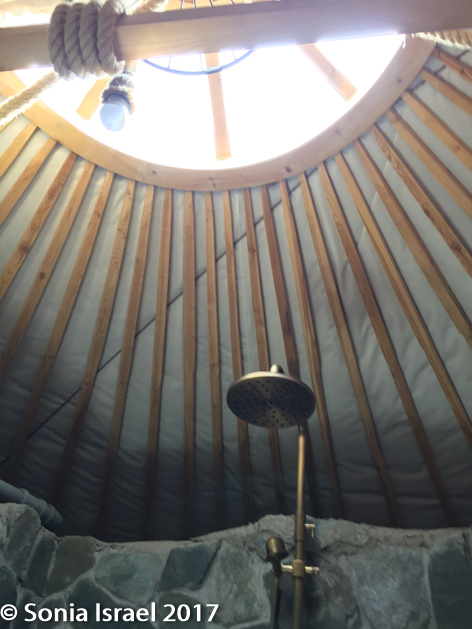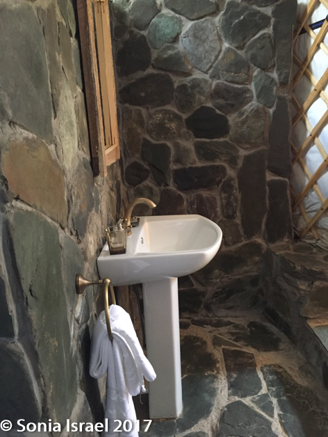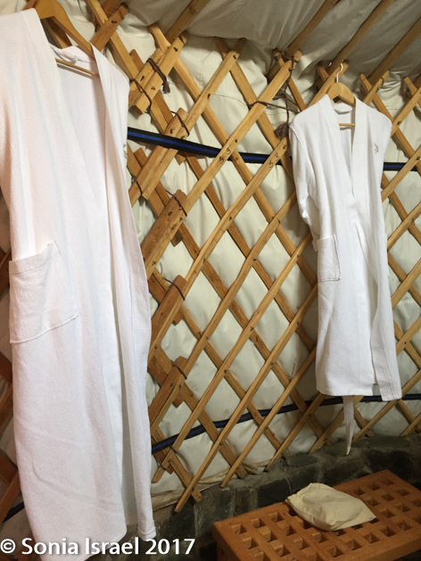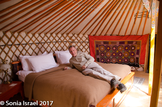 Andy and I entered our ger and just stood there in amazement. It was a traditional Mongolian felt ger, but much more luxurious. And there was a second ger attached to the first. The main ger had a large double bed, the ever present stove for heat (which we did not need), two comfortable chairs, a red saddle and other pieces of art that Jalsa has collected over the years. And electricity and outlets! The second, attached ger was our bathroom, with a stone floor, stone shower, stone wall partitions and plenty of hot water. We did need to be mindful of water usage, but still, it was a lovely shower. There were slippers and robes and of course shampoo and soap (remember at the other ger camps we had to have our own soap). And in keeping with Mongolian tradition, each ger has a southward-facing entrance, so we could look out at the unobstructed views of the desert and the Gobi-Altai Mountains.