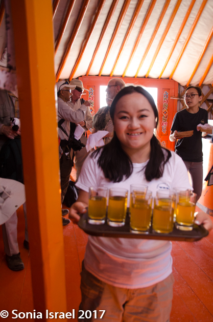 But I am getting ahead of myself. We climbed out of our cars, glad to have finally arrived. We entered a large, very large ger which was the reception area and gift shop. We were welcomed with warm towels and a glass of iced juice. And Jalsa came and introduced himself. He told us his story (as I relayed above) and made us feel at home. And he taught us the following trational Mongolian proverb, which I really liked: “While your father is alive, make as many friends as you can. While your horse is alive, travel as many lands as you can.”