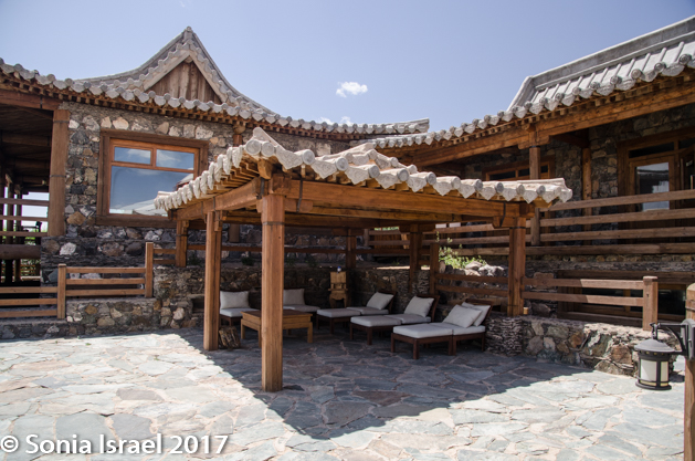 After our early morning flight and our morning introduction to the Gobi, we finally, finally arrived at the Three Camel Lodge. The first thing we saw was a large herd of horses milling about a water trough. Then behind the horses were the gers, all lined up with their brightly painted orange doors. This was not your usual ger camp. This was a place that “offers a luxurious take on the traditional nomadic lifestyle.” That’s what the website said. But I don’t think any nomads live like this.