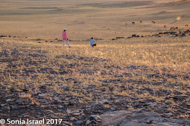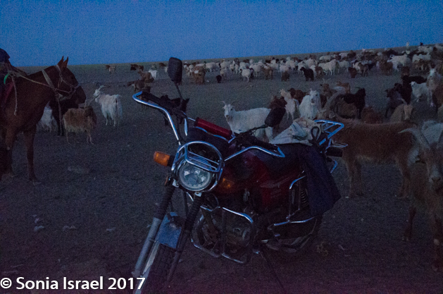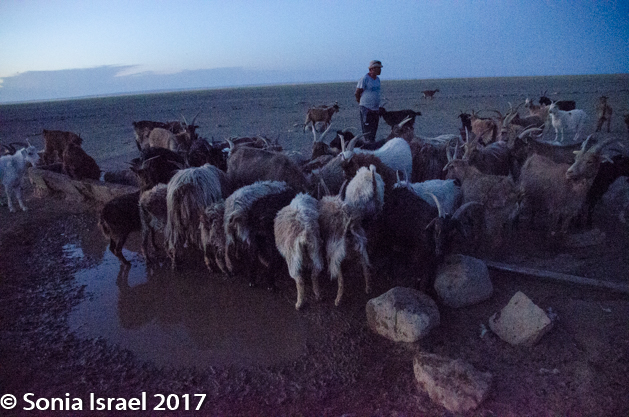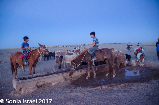 We watched the sun set for a bit (not the most beautiful sunset we’ve seen here) and then wandered back down the mountain and walked over to the watering hole. A nomad family was there, herding their animals, with motorcycles and trucks. Once all the herding was on a horse. Now that horse has been replaced with a motorcycle. The children smiled at us and posed. The adults did too. The light would have been perfect had we walked over a bit sooner (as some of our friends did), but we still got to observe nomadic life on the desert at dusk. Not a bad thing at all.