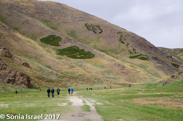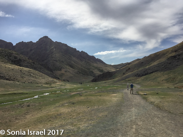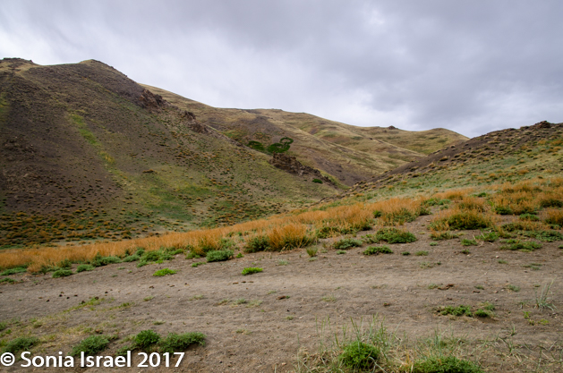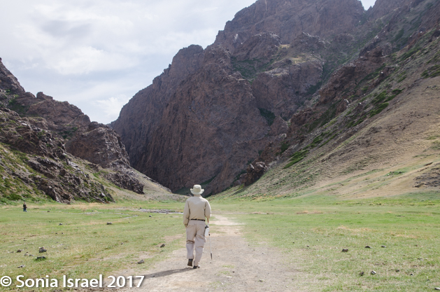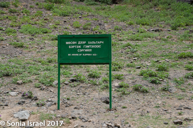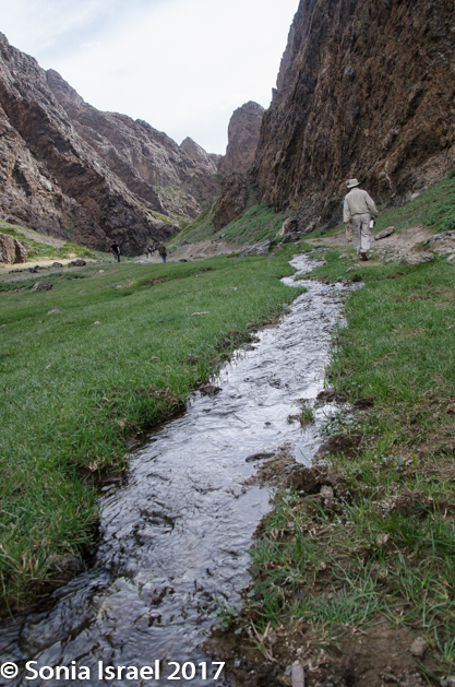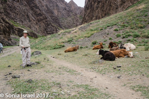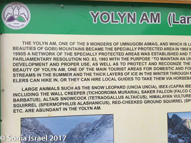 They “rode” with us until we reached our destination, Yolyn Am, which means Lammergeyer’s mouth. The lammergeier is an eagle, so it is also called Eagle Valley. A third name is the Eastern Beauty as it is in the eastern part of the mountain range, at 6000 feet. Yolyn Am is a dramatic chasm that cuts a narrow path through the foothills of the arid Altai Mountains.