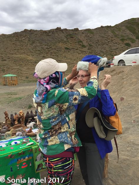 We had arrived early so no one else was there when we walked in. Now there were tables set up with souvenirs for us tourists to peruse and hopefully buy. One older woman was selling hats along with the other souvenirs. Homemade hats made of rabbit. I looked them over trying to decide which I wanted. I had no intention of ever wearing it, but rather just wanted to add it to my hat/headdress collection. So Azza tried it on to show me how one wore it. I bargained using sign language. She held up four fingers. I held up two. We met in the middle at three. And then Azaa and the woman selling it made me try it on. I got my hat and a gift of a small felt camel. We took pictures and became fast friends.