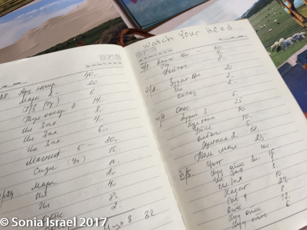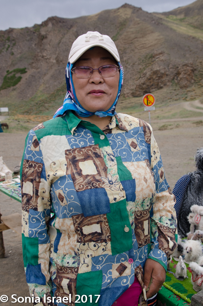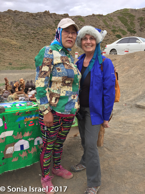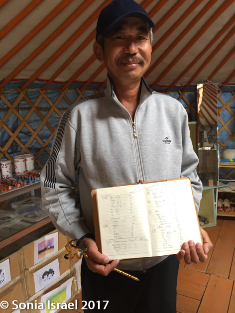 Outside the museum were some colorful gurs that turned out to be souvenir shops. One also had homemade hats (the owner proudly told me his wife had made them), at about 5 times what I had paid for mine. I guess when you sell inside a ger vs. on an outside table, there is more overhead (joke). As with all gers, the door was small and even I had to bend down so as not to bump my head. I made a joke (using body language as we had no other common language) and he asked me to write in his book, above all the visitor’s signatures (most of which seemed to be from Mongolia): WATCH YOUR HEAD. He planned on copying it into a sign to place above the door.