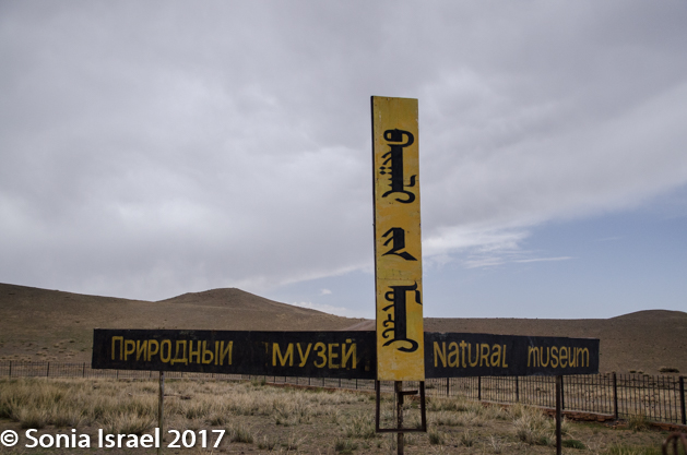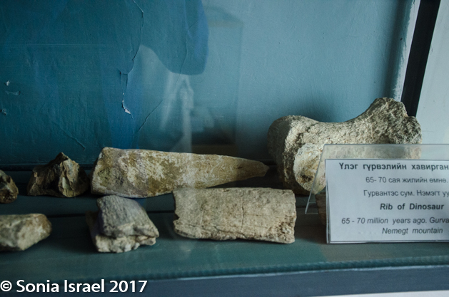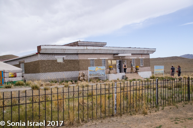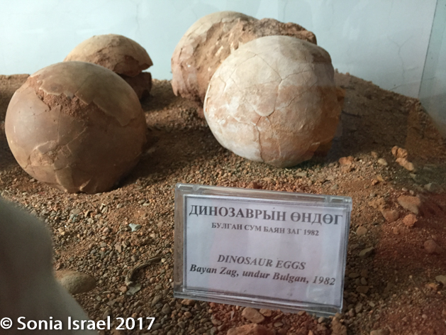 Our next stop was just outside the entrance to Yolyn Am. It was the Natural Museum, also called the “Branch Museum of Nature of Southgobi Provence Museum.” While the name was a bit confusing, the contents were extremely interesting. There were stuffed eagles and stuffed snow leopards and stuffed Argali sheep. There were stuffed animals of every sort found in the Gobi. But that wasn’t the interesting part. The interesting part were the dinosaur bones and dinosaur eggs, labeled as being 65-70 million years old. As I said, this was dinosaur country. I looked back outside at the vastness and largess of the place and could just imagine the dinosaurs roaming through the land. It must have been quite a sight. But the most we got to see were the bones and the eggs (which looked rather small, smaller than an ostrich egg which is the largest in the world. I thought of the children’s book about things small and big which taught us about the size of eggs: “The ostrich is the largest egg, the hummingbird the smallest”).