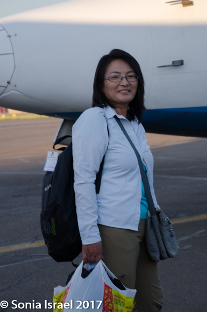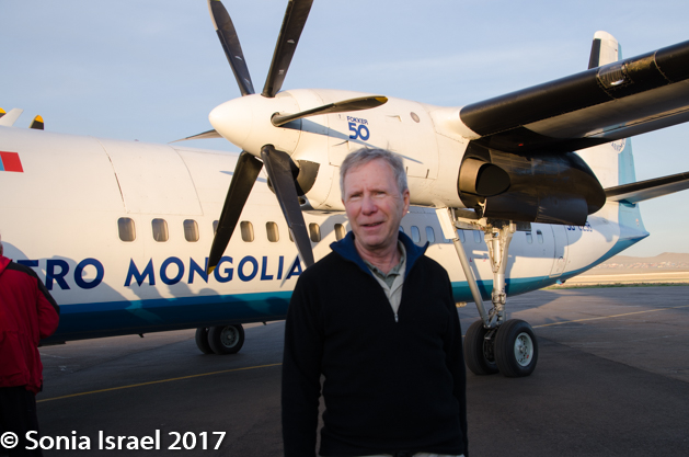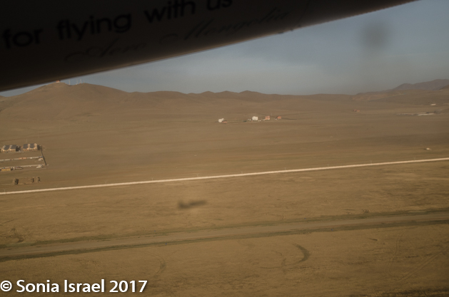 This morning we had a very, very early flight to the Gobi. Early as in 5:30AM. We were told to travel as light as possible as even our carry-on would be weighed and we would be charged for any weight over 33 pounds. That’s a hard thing to tell a photographer! But we all managed. As we went through security, every one of us buzzed and were hand checked. Not sure what the point of the metal detectors was since even with no metal, we all buzzed. The Aero Mongolia plane was a small prop, a Fokker 50, with seats 2×2 so everyone that wanted a window, got a window. And from the window we could see a message under the prop: Thank you for flying with us.