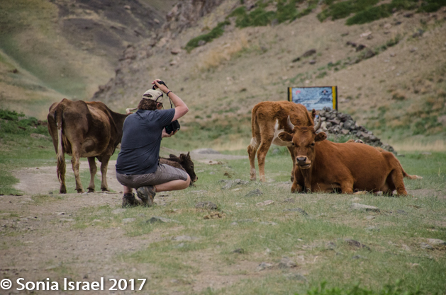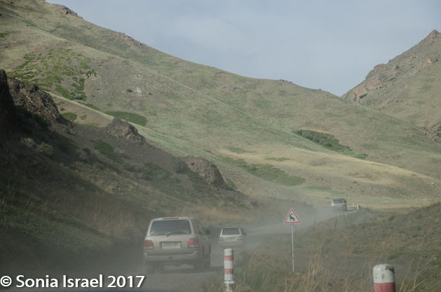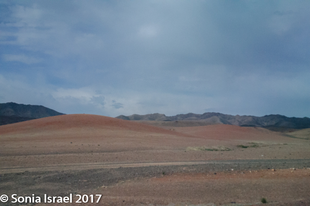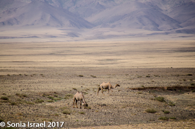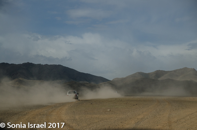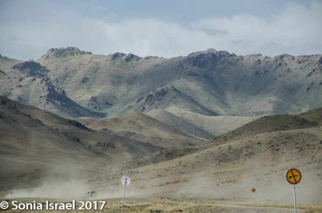 We climbed back into our respective cars and took off again, slowly making our way off the paved road and onto a path carved by previous vehicles. And we got closer and closer to the mountains until we found ourselves in the mountains. The dust from the cars ahead of us rose and enveloped the air, so each driver tried to back off a bit from the car ahead of it. Sometimes the only way can follow the car in front of you in the caravan is by the dust.  We were heading for the Gobi Gurvansaikhan National Park where we would be spending the next few days.