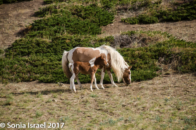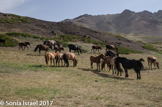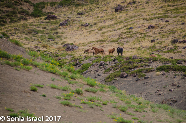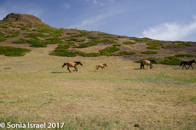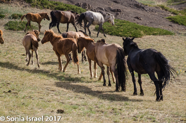Driving through here, I imagined that this must be what Mars or the moon look like. We drove and drove and then, in the mountains, we saw a herd of horses, walking along in lines, following each other, stopping to graze, walking some more, then trotting or running alongside our cars.