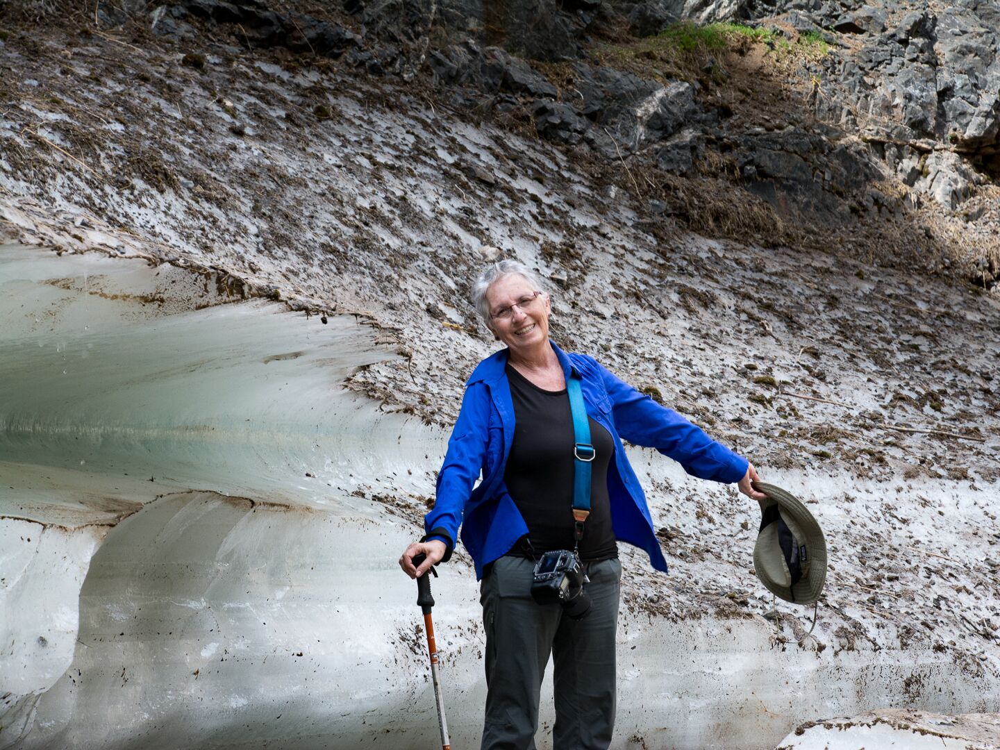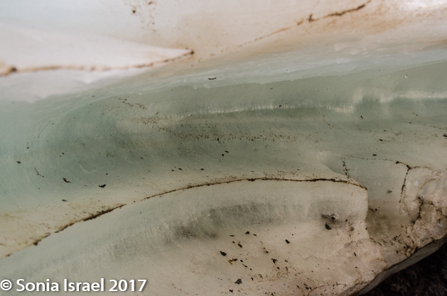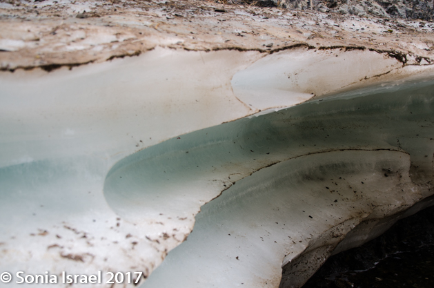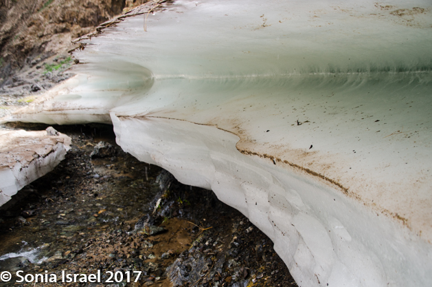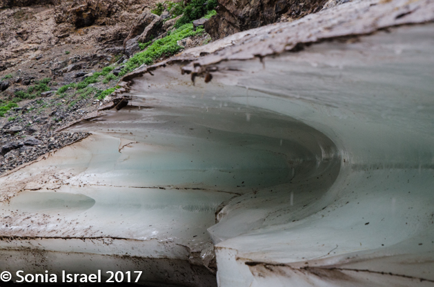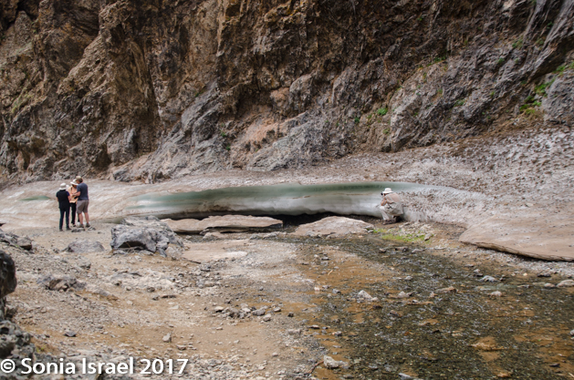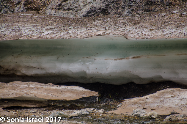 And then, as the path got narrower and narrower, and the mountains seemed to be closing in on us, we reached our surprise. The stream had turned to ice!  Blue veined ice. Ice in the Gobi dessert. This is one of the other things this part of the park is famous for. Depending on the time of year, the size of the ice field changes, but there is always ice here. Why ice? I mentioned earlier that the Gobi is at a high altitude and not like other deserts. Here it gets cold in the winter. So during the winter the small spring freezes and becomes several meters thick and several kilometers long. But we were there in summer, and the ice field, or in this case more like an ice shelf, was still there. The narrow, heavily shaded canyons are cool with little sun and this keeps the ice from melting well into the summer. And thus we got to see and touch ice in the Gobi.