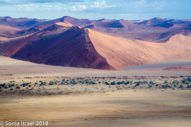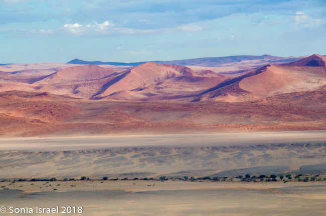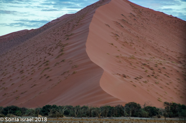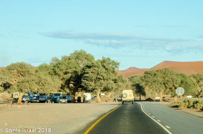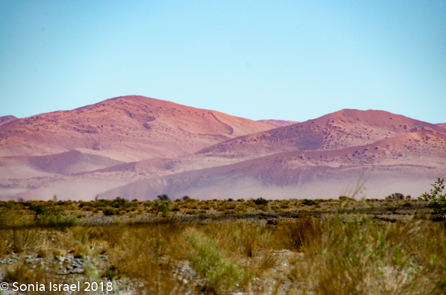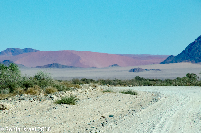 We knew we were getting close as we began seeing the dunes. At first they looked like white sand with little puffs of brown grass. There was a line of trees in front of the them, looking like a green line. And then the dunes turned red. The sky was still a brilliant blue. There were clouds of dust from the car. And it was almost surreal. It was these red dunes that made me want to see Namibia in the first place.