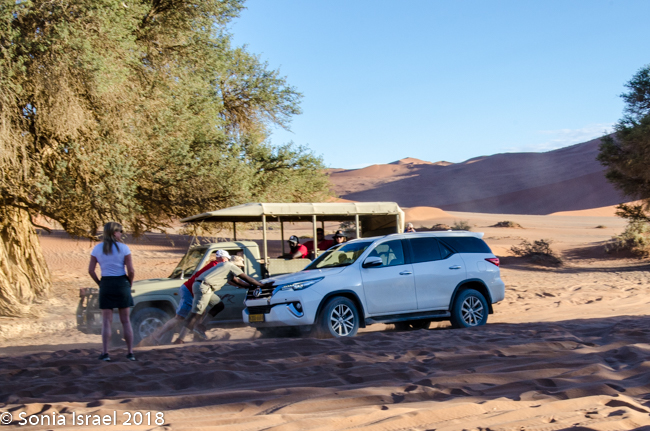 But I was antsy and wanted to get into the heart of the park. We passed the parking lot, where most cars should stop and park and then shuttle in. The ridiculous part was the number of cars that thought they could drive all the way in. We were in a Toyota Land Cruiser with an experienced driver. We stopped just at the other side of the parking lot so Charles could reduce the amount of air in the tires. Turns out that is how you drive in deep sand. But we were surrounded by all these cars that had gotten stuck in the sand. One by one they came over to ask Charles what to do. Some of the guides helped them push their cars out of the ruts, where they then left them to shuttle in. It was hard for me to believe that people were self-driving in an area where they know nothing about how to survive. That is just one more reason that I like having a guide/driver.