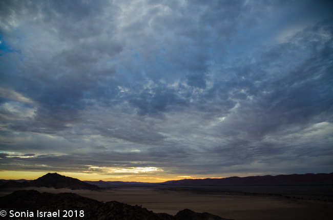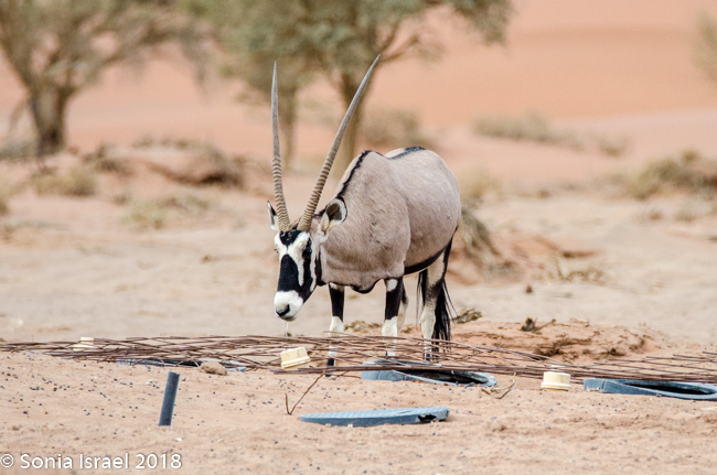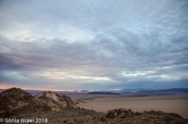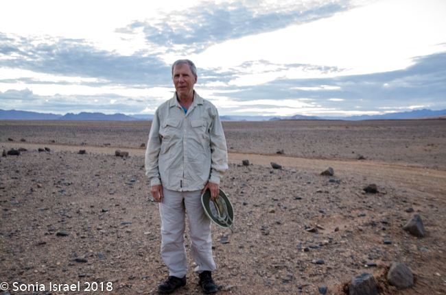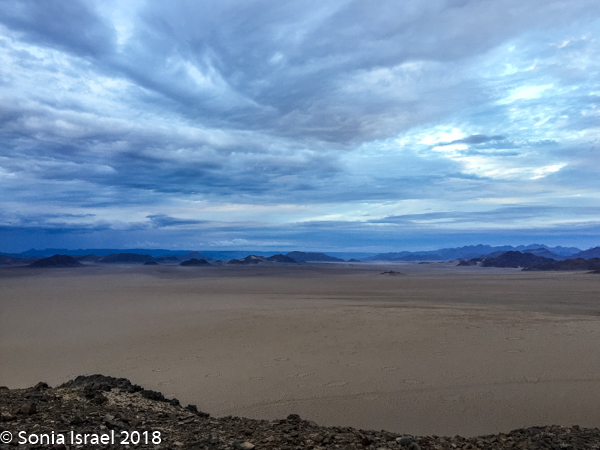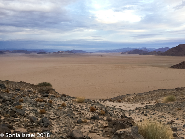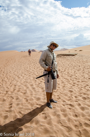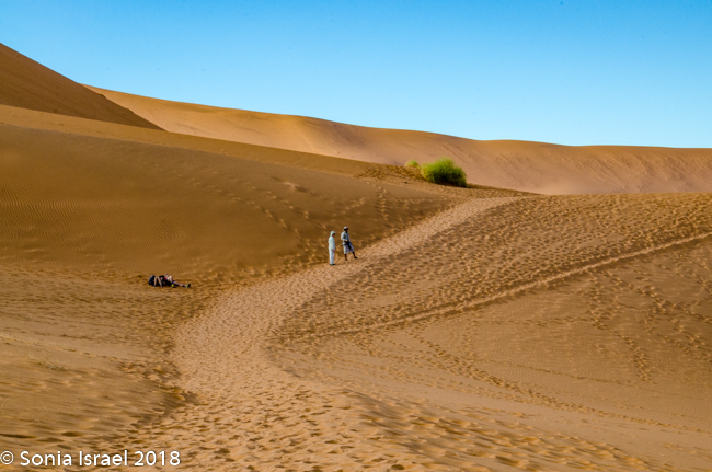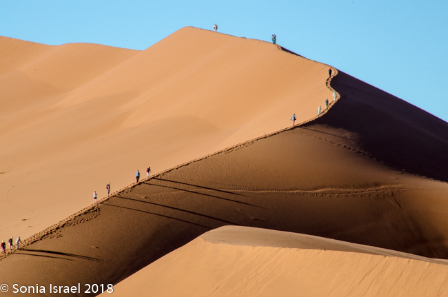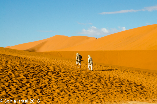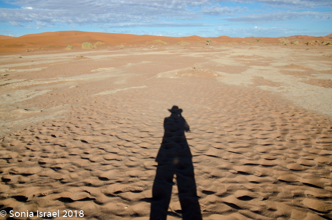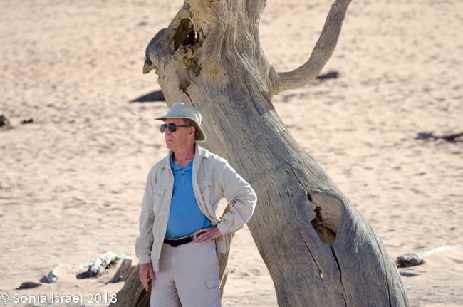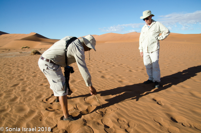We walked a short way and Charles stopped us again, drew a map of Namibia in the sand, and gave us a lesson on the geography. Sossusvlei, which means “a gathering place for water” (sossus) combined with Afrikaans for “a shallow lake” (vlei), was created by the wind from the coast carrying all the sand. Where does this “shallow lake” come from? It comes from the dense ocean fog created when the dry desert air forces the humid ocean air down. There is one bug that is particularly adapted to this climate. The Namib Desert Beetle waits for the fog to settle on its back, and then drip down into his mouth. Amazing!