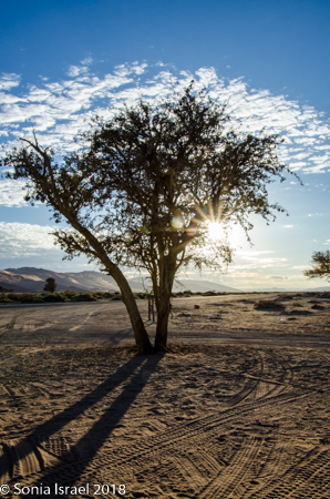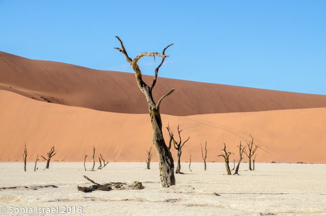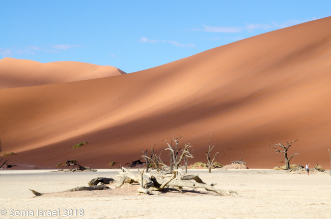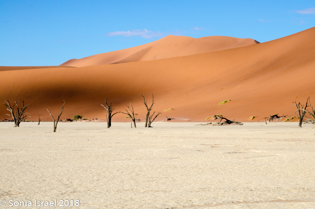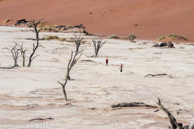 Our destination was Dead Vlei. This is a white clay area in the middle of Sossusvlei. Dead Vlei means “dead marsh” (from dead in English and marsh (vlei) in Afrikaans). As we crested over the dune, down below was what looked like a white, dry lake covered with dead trees. Or an ice-skating rink. It was so white against the apricot-orange sand. The area was formed after a heavy rain which caused the Tsauchab river to flood, thus creating temporary shallow pools. Camel thorn trees (also called giraffe tree or the acacia tree) began to grow in all that water. But when the climate changed and drought hit, the sand dunes encroached on the clay area, blocking the river. The intense sun dried the lake and the trees died. All this happened 600-700 years ago.