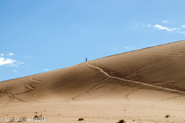 We stopped along the road to admire the dunes and to photograph the different angles and shadows. And this was all still close to the entrance. Charles explained how there are three different types of dunes, and just standing along the side of the road, he pointed out each one. There were the linear dunes which had straight or slightly sinuous sand ridges, which are usually longer than they are wide, thus called “linear.” Sometimes linear dunes form sets of parallel ridges separated by miles of sand or gravel, while others merge to form y-shaped compound dunes.  The second type of dune Charles pointed out was the star dune. These are radially symmetrical dunes which are shaped like a pyramid and have three or more “arms” which radiate from the high center of the mound, thus resembling a star. The third, and most common, was the barchan, or crescent dune, is shaped, as the name implies, like a crescent which is usually wider than it is longer.