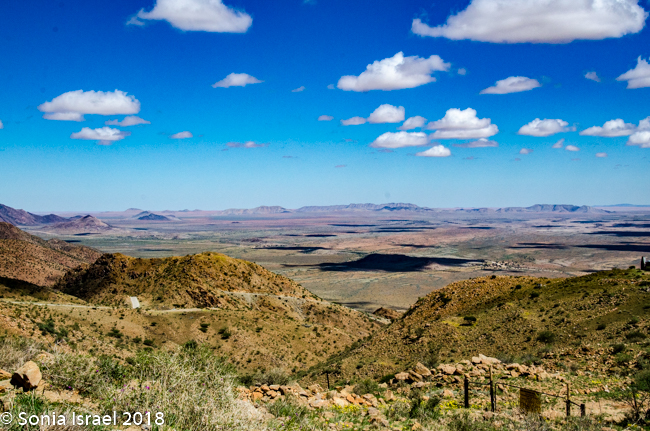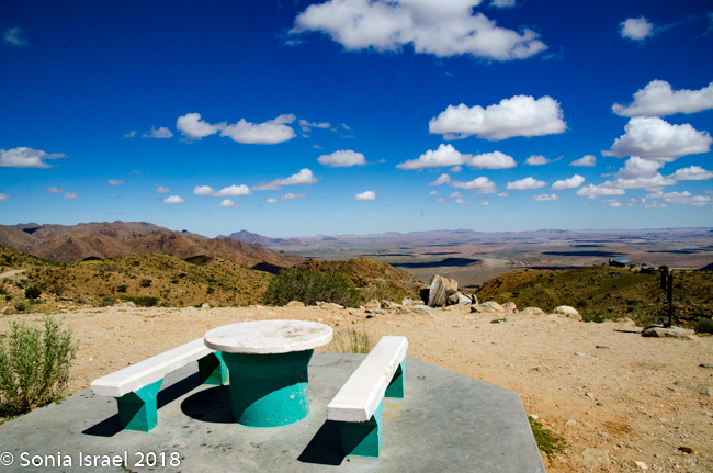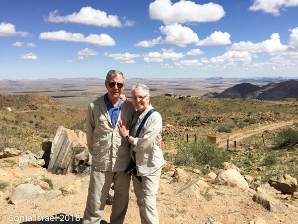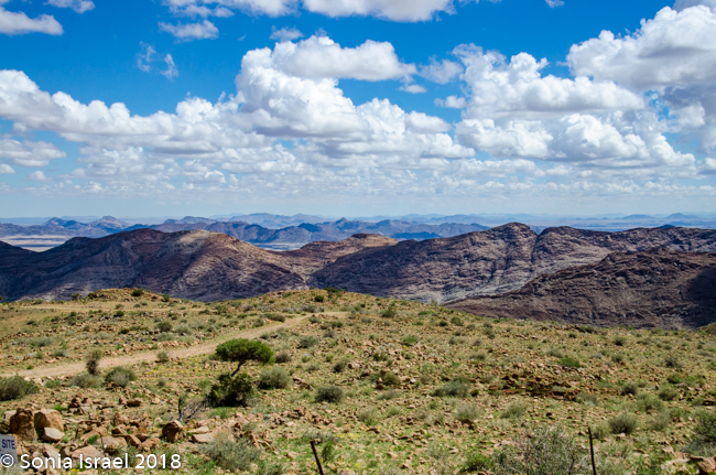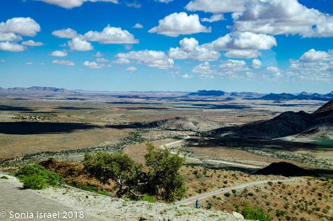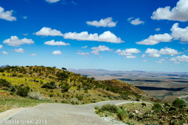 The drive continued. Our first “official” stop, other than stops to use the “bush toilet,” was a magnificent view point, Spreetshoogte Pass. This mountain pass connects the Namib Desert with the Khomas Highland. It is the highest point at 5839 feet above sea level and it is the steepest pass in Namibia, dropping 3300 feet within 2.5 miles of road. On the way down, I held Charles’s phone to do a video of the steep winding road.