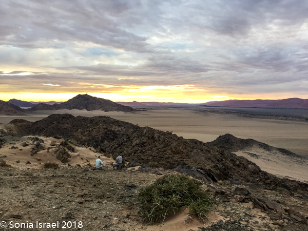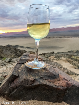Charles drove up a mountain. Literally. No real road. Just 4-wheel drive pushing us and the car up a mountain. We stopped close to the top, got out and walked a bit higher. Charles took out a platter of cheese, nuts and fruit. I had my wine and Andy his beer. But the most important part was that from there we had a 360 degree view of the valley. The large expanse of sand. The dunes. And just as the sun had turned the dunes into fire in the morning, it now turned the sky into flames.
