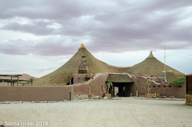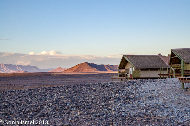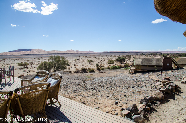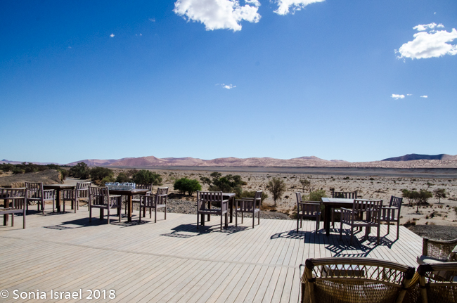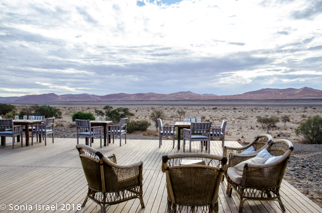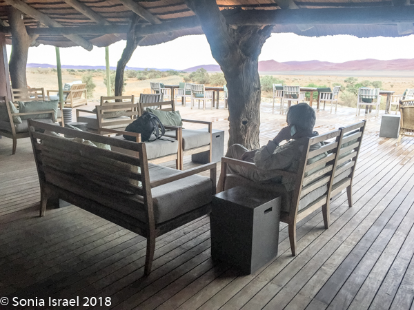 We were shown to our tent, which like the other 22 tents, faced the dunes. The advantage of the Kulala Desert Lodge, which is a Wilderness Safari lodge, is that it is the only lodge located inside the Namib Desert within the private Kulala Wilderness Reserve. Kulala means “to sleep” in Swahili. Kulala also means canvas tent, and that is exactly what the accommodations were. A large canvas tent, with screened windows which had a canvas cover you could Velcro in place, a screened door, a bathroom and veranda, and stairs leading to a wooden platform where you could sleep at night, under a million stars. Unfortunately, the weather did not cooperate for outdoor sleeping. There was a large living-room type lounge, a bar and both indoor and outdoor eating, depending on the weather. But both locations had spectacular views overlooking the desert vista. There was also a swimming pool, but the water was freezing.
