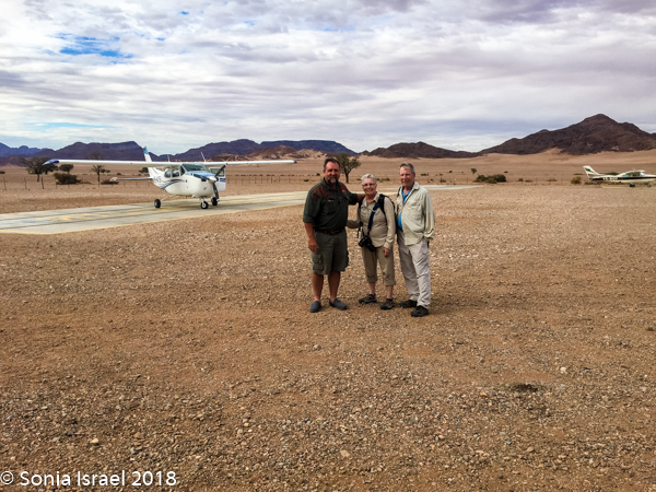 This morning the balloon ride was canceled again. Charles decided that instead of subjecting us to a 5-6 hour drive to Swakopmund, especially since it was not a very interesting road, he would arrange for us to take a scenic flight from Sossusvlei to Swakopmund with the company Sossusfly. He drove us to the private Wilderness Safari airstrip where we met up with Katherine, a Swiss woman traveling alone. The airstrip is the only one in this area, but like in most of the bush, it was just a sand strip with a shack holding the extra fuel. The tiny 5-seater Cessna 200 (including the co-pilot seat) landed and we noticed there were two passengers on board all ready as some make a round-trip. The pilot came out to shake our hands and introduce himself. He then looked us over deciding who the photographers were and where we should each sit. At first he suggested I sit in the second row, but then he realized that Katherine was very tall with very long legs. So Andy and I were delegated to the third and last row where we squeezed in.