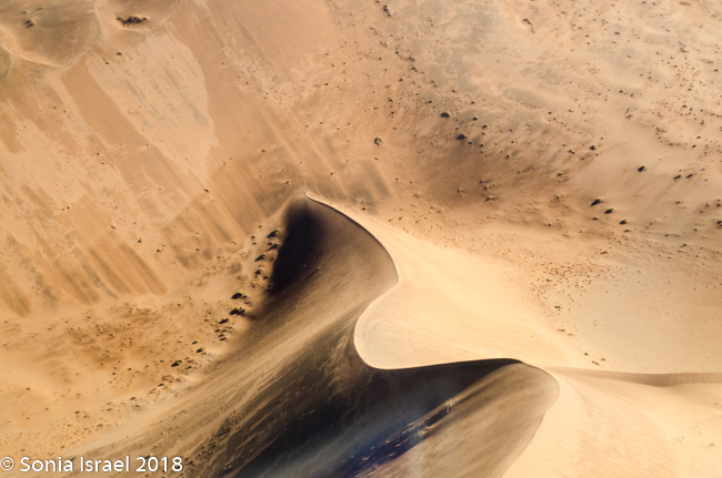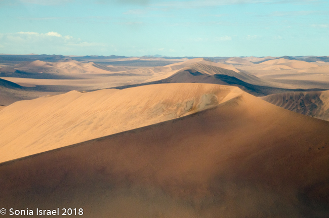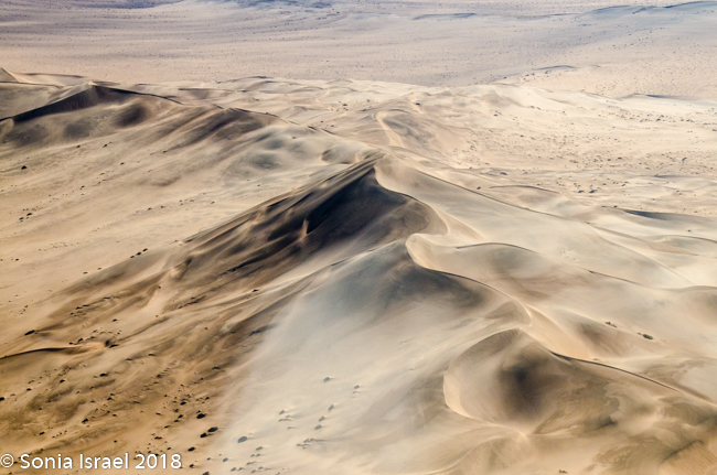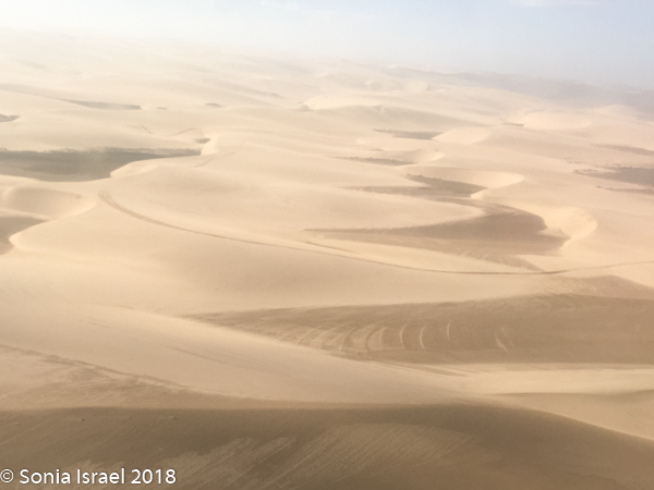 The views however were spectacular. We flew over the dunes which, from the sky, ranged in color from pale apricot to brick orange to deep red and then slowly turned white as we headed north. The shapes created by the wind and the shadows were amazing, creating all sorts of designs. The sharp edges at the top of the dunes looked like they were drawn with a ruler.