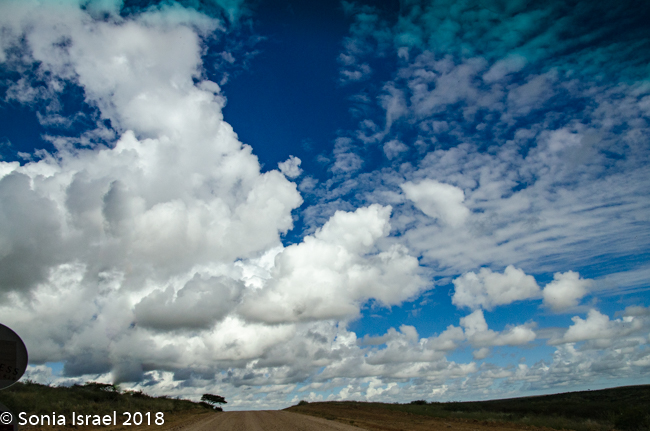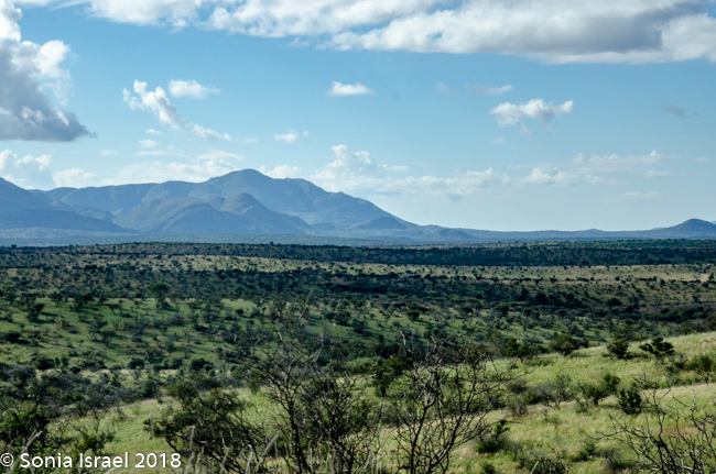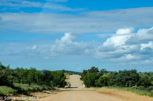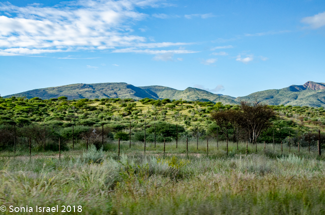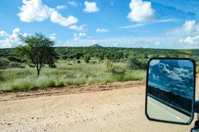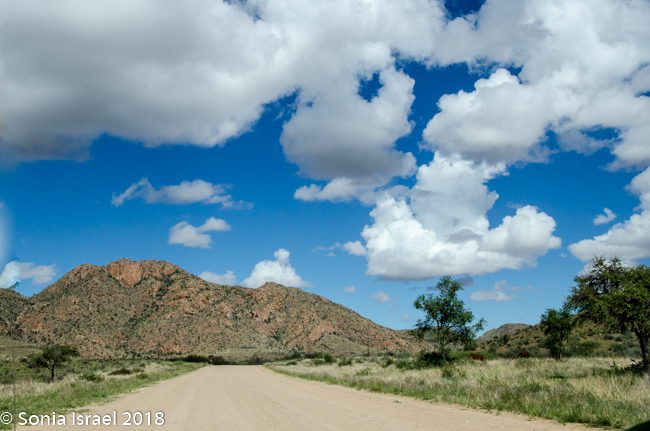 Although Namibia had been having a drought for the last seven years, there was recently lots of rain and that made the roads even more difficult to navigate. But it also made everything green. There were shades of green everywhere. The grass was a light green with dark green polka dot bushes. There were red tips on the green grass alongside white puffs of grass (these clumps of grass are called Bushman Long Grass, although it looks short because the animals keep eating it). The road was a red/brown. And the sky was a deep blue with billowing white clouds. It was a rainbow of colors which made for beautiful vistas.