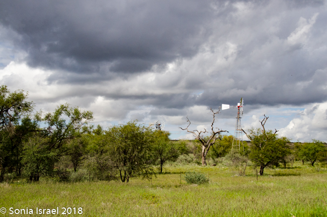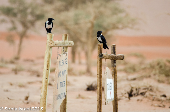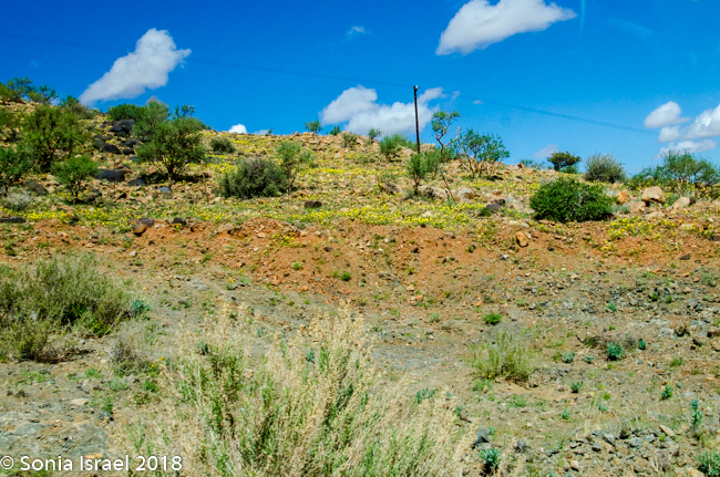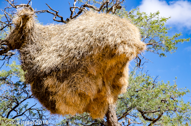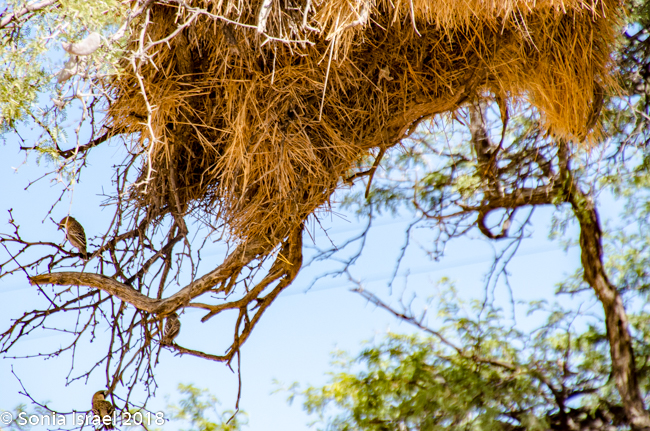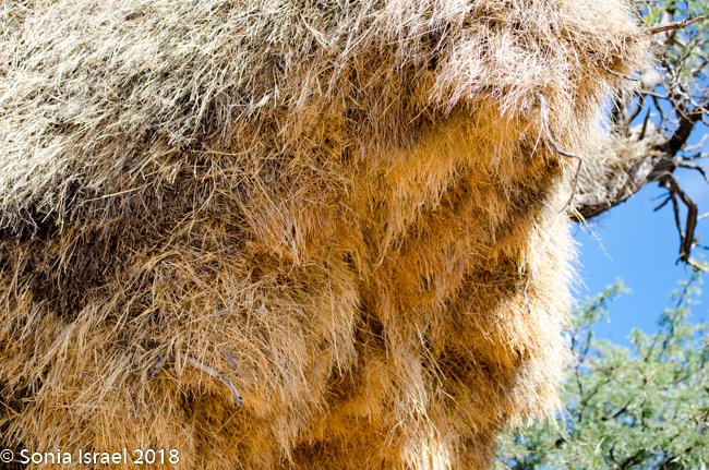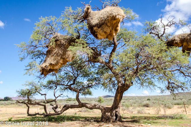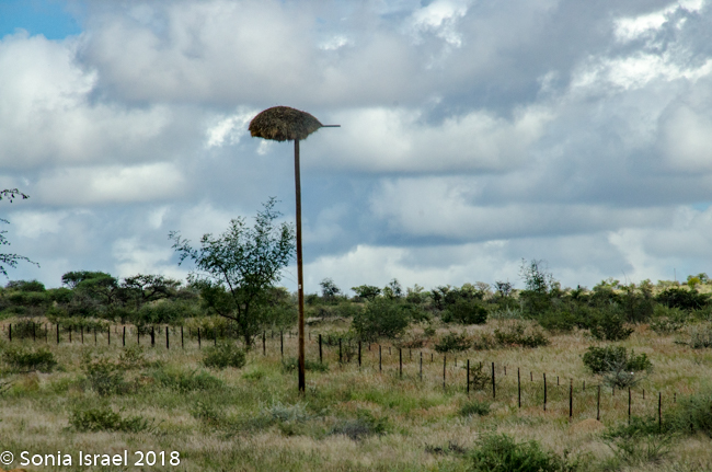 After a quick bite to eat, we hit the road again. Suddenly I saw the strangest tree, or what I thought was a tree. It looked like a tall bark with a large nest on top. Turns out it was an electric pole, with a large nest on top. One after the other. And then I noticed similar large nests in the surrounding trees. Charles pulled over next to one particularly large one and explained that these were nests of the Sociable Weavers, very small birds who build very large nests with up to 100 entrances for about 200 birds. Like a condo unit! The large nest keeps them warm in the winter and keeps the sun off of them in the summer. Each entrance is short and is shaped like a 7 which keeps out their predators.