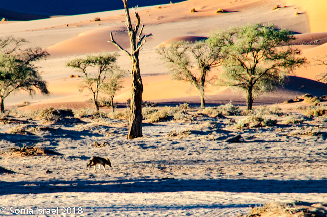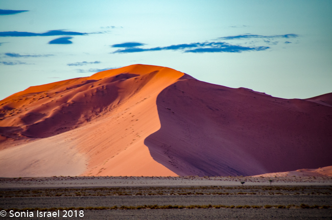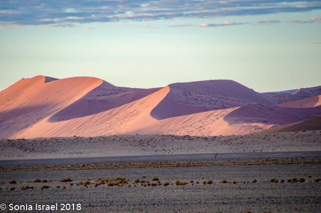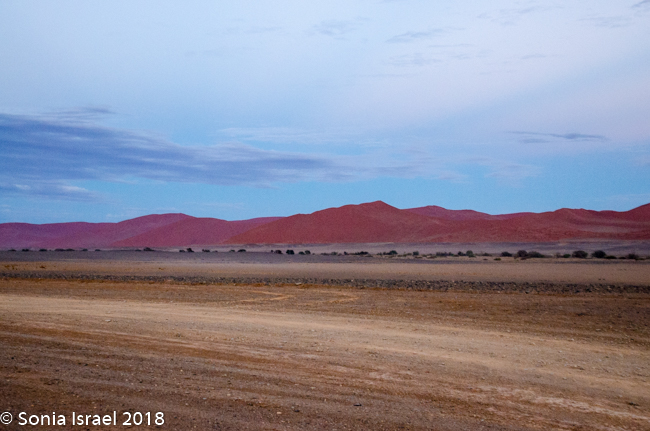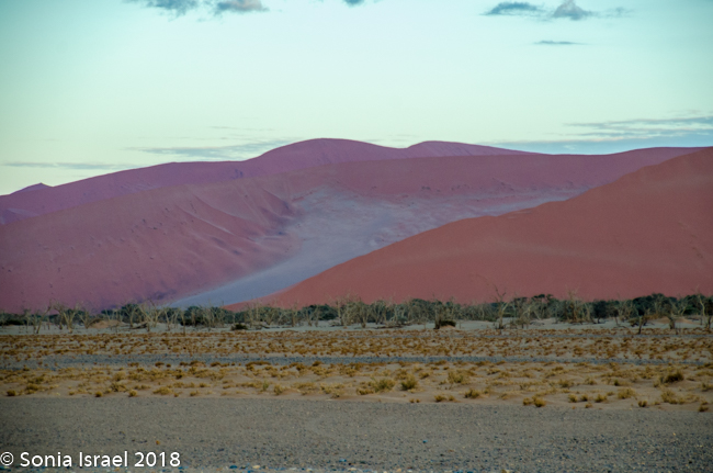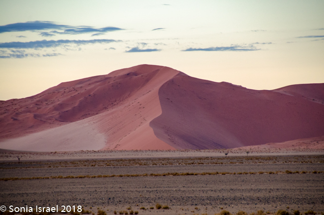 The advantage of staying right in the park, so close to the dunes, is that we could be there just as they opened at sunrise. There is one small lodge inside the dunes that many photographers reserve so they could actually watch the sunrise over the dunes. But we took the private Kulala road right to the gate of the reserve, where we watched the sunrise while waiting for the gate to be unlocked. There was a bright orange strip as the sun rose over the horizon, the clouds in the sky turned from white to black to dark blue to pink. It was beautiful. The light reflected on the dunes making them look almost striped in three shades of pink, light pink, dark pink and purple. I had never seen anything like it.