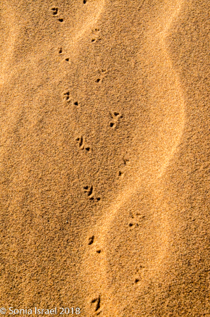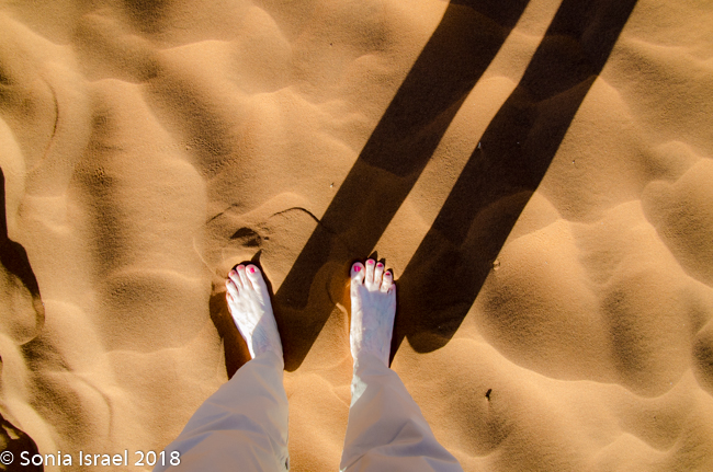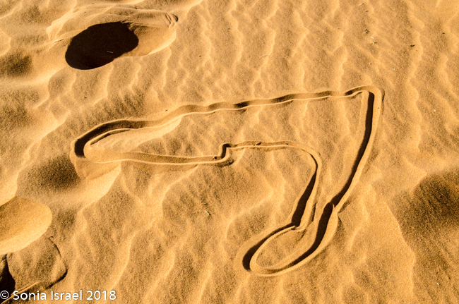 We started walking on the sand, and Charles would stop to show us snake tracks and scorpion tracks. Nevertheless, I took off my shoes to feel that fine sand between my toes.