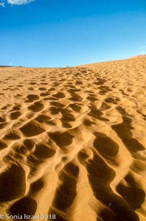 We walked some more and more and more. The dunes were spectacular as they towered over us. The sand was like silk between my feet. It was red, yet pinkish all at the same time. As the light changed, the color changed. It went from red to pink to gold. Some of the dunes had small, light brown patches. It was as if the dunes had a fire within them.