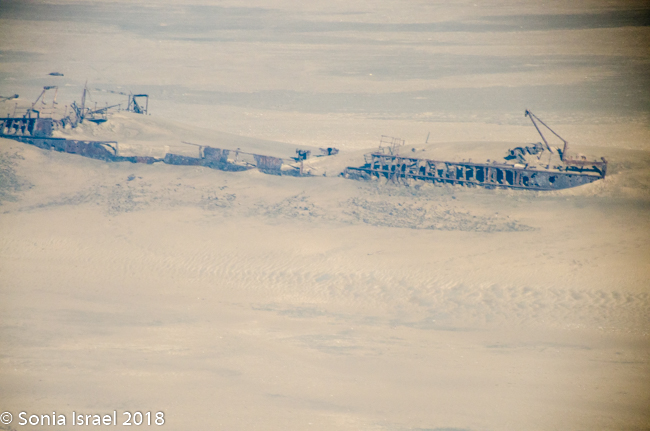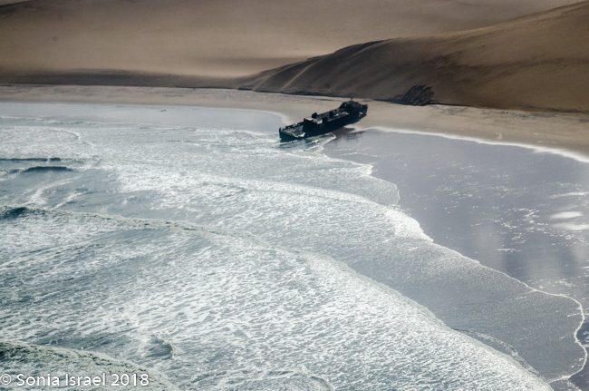 We flew over the Eduard Bohlen and Shawnee shipwrecks along the Skeleton Coast. There are several thousand shipwrecked vessels along this coastline, as well as sun- faded whale bones, and at one time, human bones. The areas rough seas, roaring winds and strong ocean currents are the main reason for these wrecks. But what makes these special is that, although the were gounded in the water, the water line has receded, and the desert has encroached and now it looks like the remains of the ships were stranded in the middle of the desert. (Please see the post about the Skeleton Coast for more info on this).