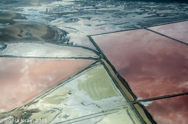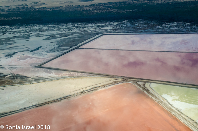 We flew over the salt mines just south of Walvis Bay with their red, and pink and green hues. These salt mines supply about 90% of Africa’s salt. It is the largest of its kind in the world. There are vast areas that were leveled and surrounded by low dikes. Sea water is pumped in and left to evaporate in the hot Namibian sun. The salt then crystalizes forming mounds which look like snow. It is also a rich feeding ground for shrimp and larval fish, thus the colors. And, together with the Walvis Bay Estuary (more on this in the Swakopmund post), it is one of the most important wetlands in Africa. The nutrients in the ponds sustain flamingos and as many as 60 other species of birds, with up to as many as 120,000 viewed there at one time. As a supplementary operation to salt production, oysters are also produced here.