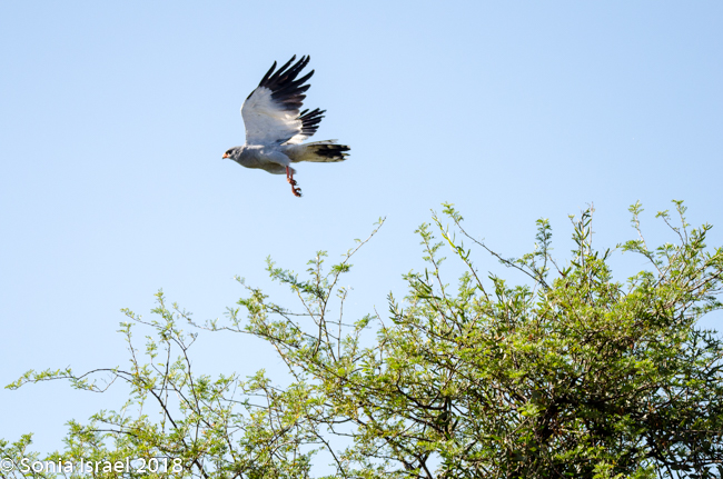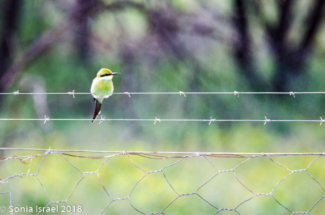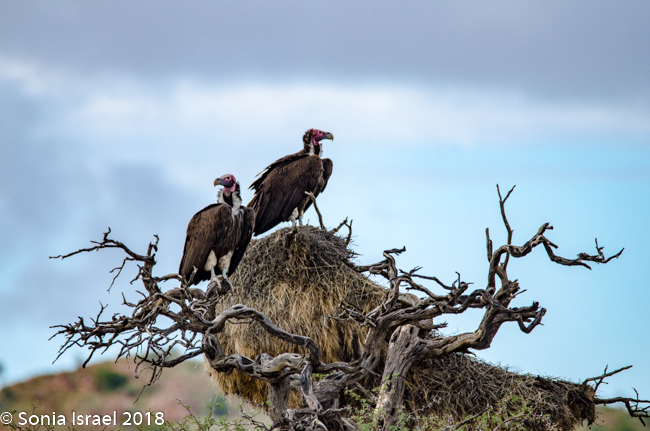 We were driving through the semi-desert, but suddenly, the landscape changed and the bushes were so dense that it looked like a large green carpet, with little yellow spots, the flower Cleome, also called whiskers. There were birds everywhere. We passed a pale chanting goshawk, a swallow tail bee eater and two leopard faced vultures sitting in a tree. Charles would ask us questions, which when we couldn’t answer, he would use as a jumping off point to teach us something. Did we know how to tell the difference between a vulture and an eagle when they are flying in the sky? Of course we didn’t. But we do now. Vultures have straight wings and eagles have bent wings.