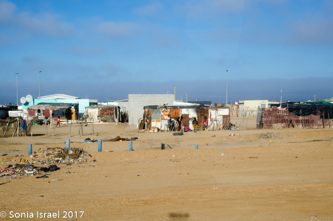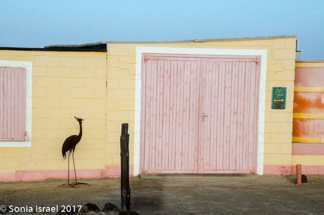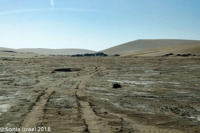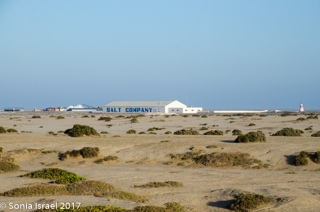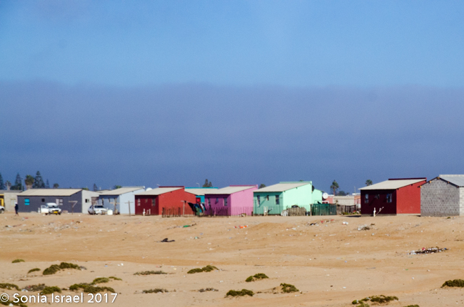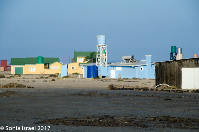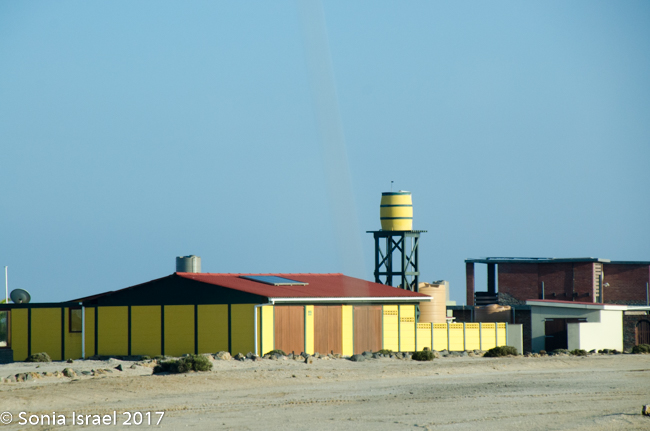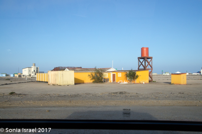 Did I say there wasn’t much to see? There was. We passed a salt mine with mountains of what looked like snow. We saw birds of all sorts. We saw small green bushes come and go and the sand. We saw sand dunes suddenly arise from nowhere and just a quickly, disappear back into the flats. We passed small groups of houses, not even as large as a village, where fishermen or those working in the mines lived. And their homes were all big and colorful, breaking up the white of the sand. Those colorful houses were built by the Germans which is why they were all so large. Then they were bought by the Uranium mines, which are owned by an Australian company, for their workers.