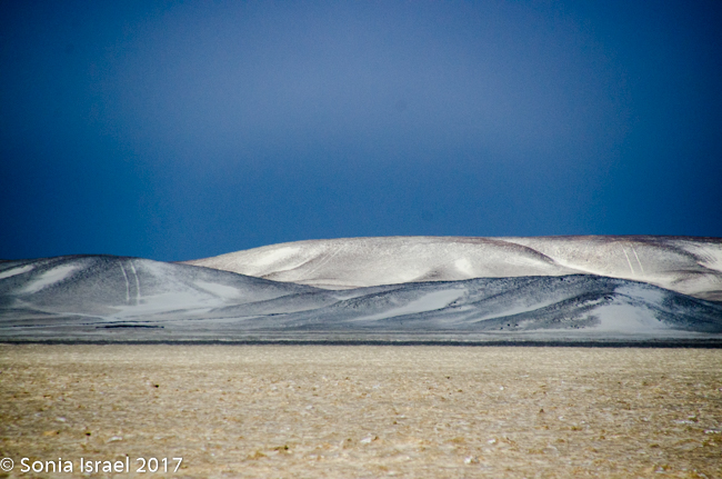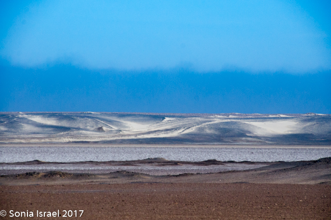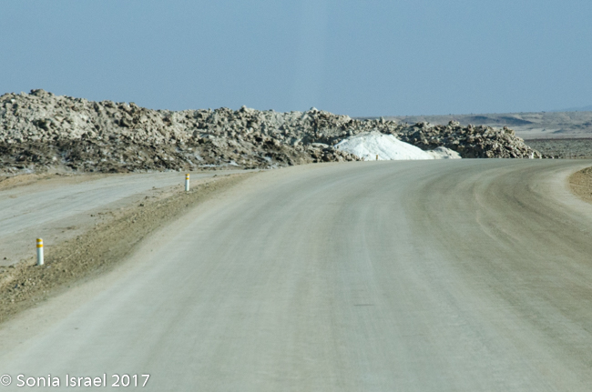 And then we hit the road again. We continued north. There were riverbeds that were all dry and easy to drive over. The desert was vast. The terrain kept changing. Suddenly there would be huge patches of what looked like snow. It was salt.