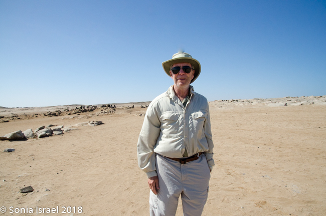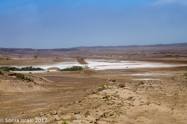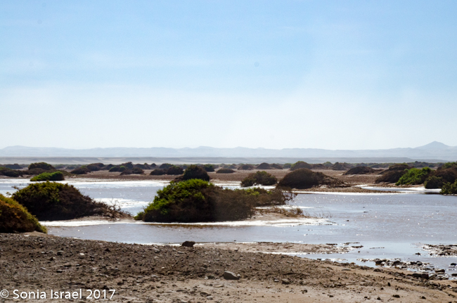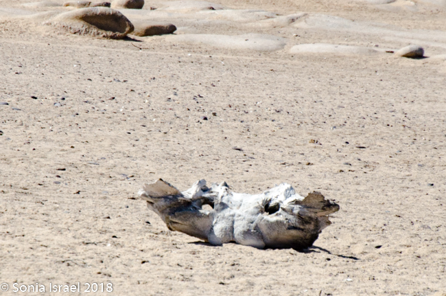 We began to see some remnants of whales, reminding us why this is named skeleton coast. We drove over the area where the mouth of the Hoanib River meets the ocean. We would camp near this river tonight, but many, many miles from here. Charles again drove off the road to another lagoon to look for flamingos, but they had all flown to Etosha to find a mate.