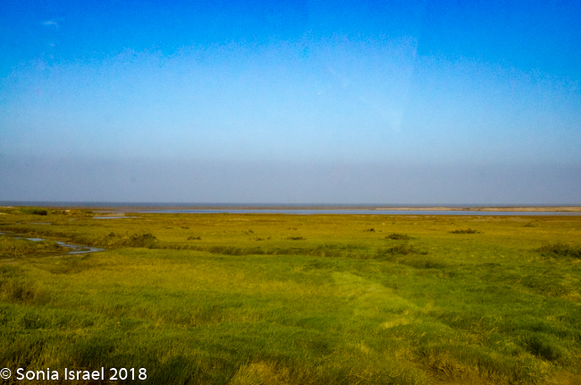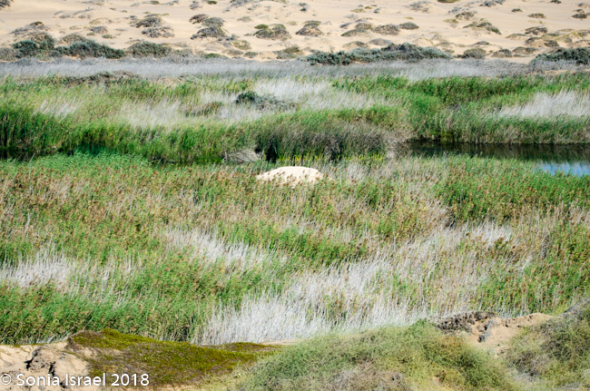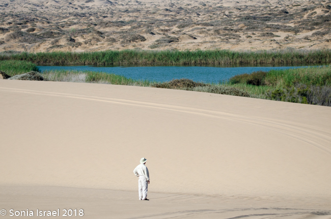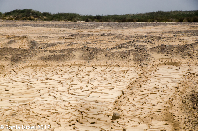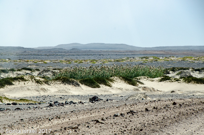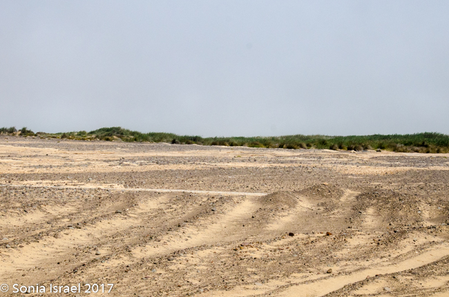 The white dunes were now paralleling us. Tall green reeds appeared and there were green mounds, almost like warts, on the sand. There must have been a river here that recently dried up for there to be so much green growth.