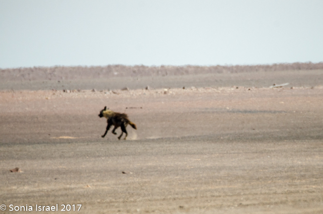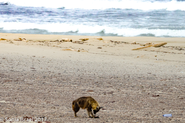 The hyena was on the beach eating, probably a seal cub. Charles told us how rare it is to see a brown hyena during the day and at the ocean. We were very lucky. We watched him for a while and he finally noticed us. He started walking towards us to explore. But then he thought better of it and went back to his eating. He probably wanted to protect his food.  We watched some more until he finally slinked away.