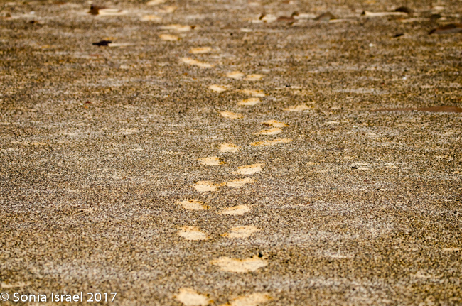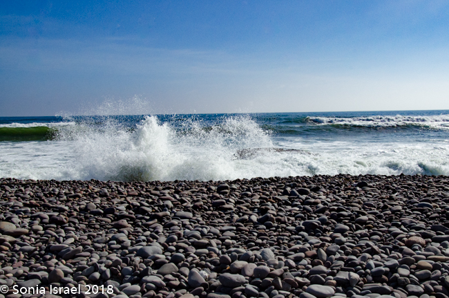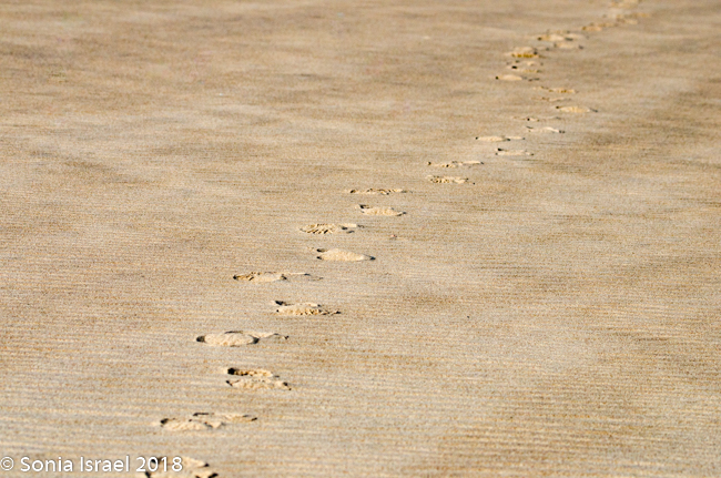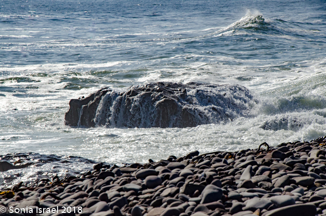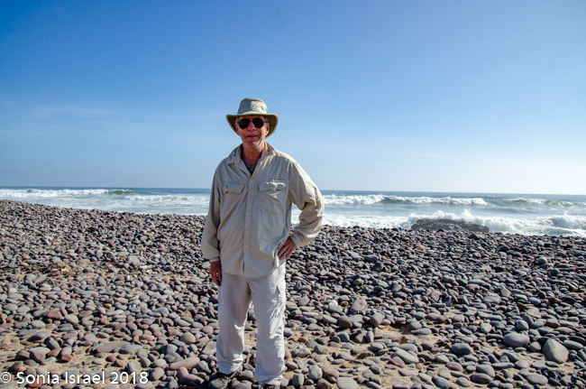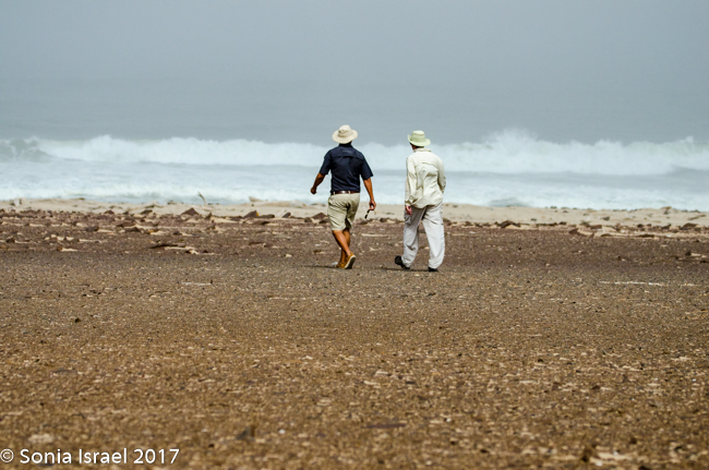 We kept driving and then, between Hentis Bay ad Torro Bay, at the mouth of the Huab River, Charles, eagle eyes, suddenly pulled over and quietly and calmly said, “There is a hyena.” Now this was one of the animals we had not seen in Botswana, and we had mentioned we would like to see one. And Charles obliged. We quietly got out of the car and tiptoed over to where we could see him better. As the camera clicked away, he ran across the road, in front of our car and to the other side, heading towards the ocean. Charles said, “Let him go.” We waited for a bit, and then followed, our feet leaving deep footsteps in the soft gravelly sand which was filled with sharp black rocks giving it the speckled dark look, and shell fragments and little white quartz which gave it a shine.