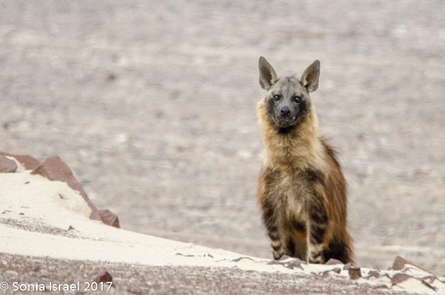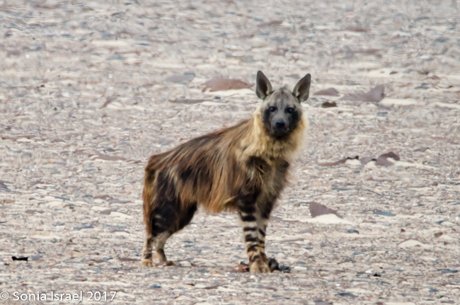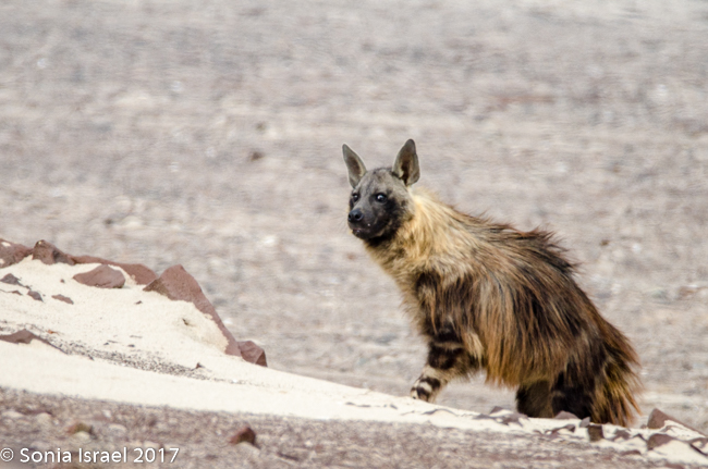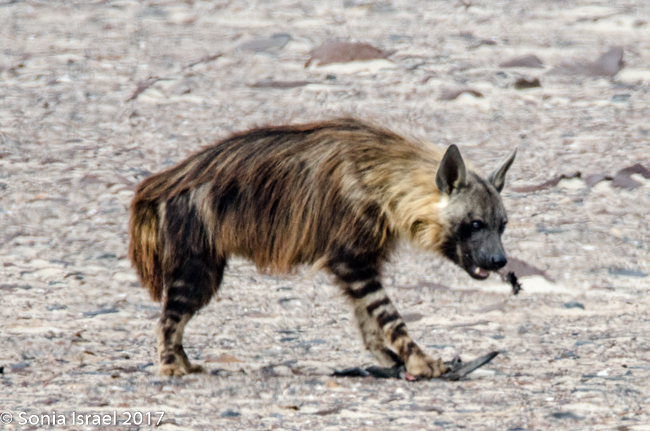 So what do we know about the brown hyena? The brown hyena, also called a strandwolf, is one of Africa’s largest, and most rare, carnivore. It is found only in Namibia, Botswana, Zimbabwe, Mozambique and South Africa and therefor is one of the rarest species of hyena. Brown hyenas are distinguished from other species by their long shaggy coat and pointed ears, a dark brown coat and a short tail. Their legs are striped brown and white, and adults have a distinct cream-colored fur ruff around their necks. That is exactly what we saw. There are about 800-1200 in Namibia, out of about 4000 in all of Africa. Brown hyenas live in clans and the male helps the female raise the cubs. But in general, they are usually seen on their own, as we saw ours, searching for food. Brown hyenas seldom hunt small or medium-sized mammals and usually rely on carcasses of animals, which died naturally or were killed by other predators. That must have been the case with the seal cub we saw the hyena eating.