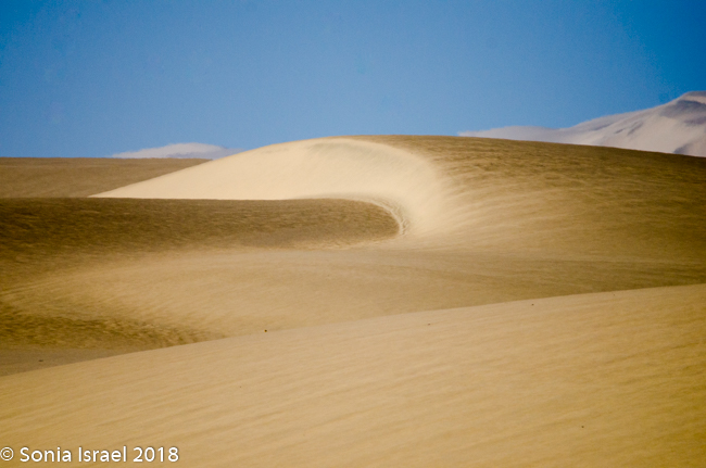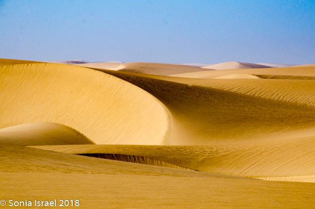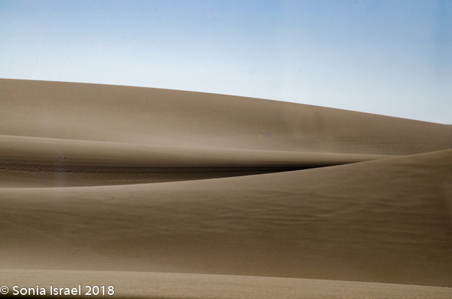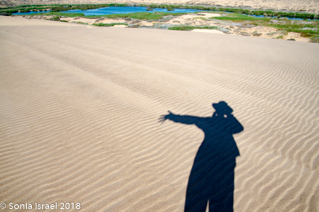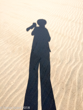It was pristine. The designs in the sand looked like the waves of the ocean. Or abstract paintings. Curves, curves and more curves. In every direction, whereever the wind had blown the sand. There was sand forever which no marks except our tracks. And our shadows as if we had three additional visitors. And we were so small, Â infinitesimal, in relation to the vastness of the desert around us. We were on top of the world.