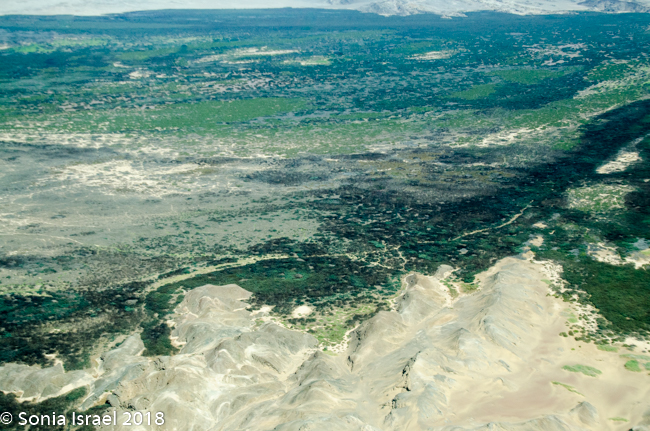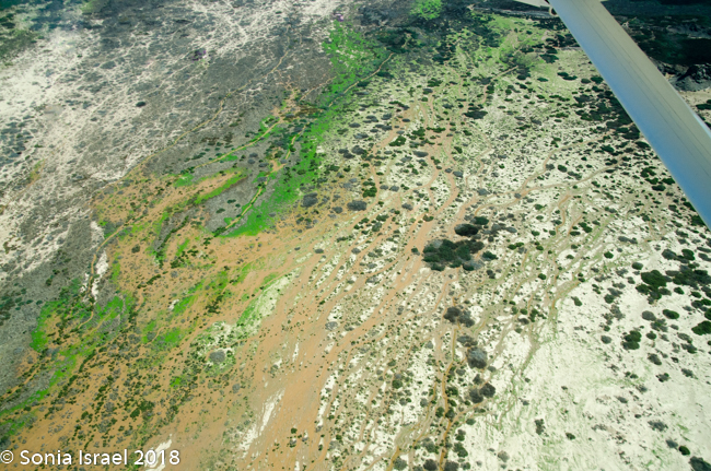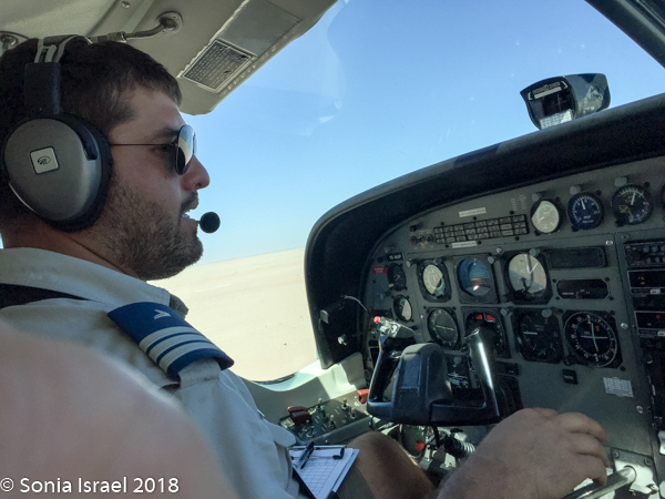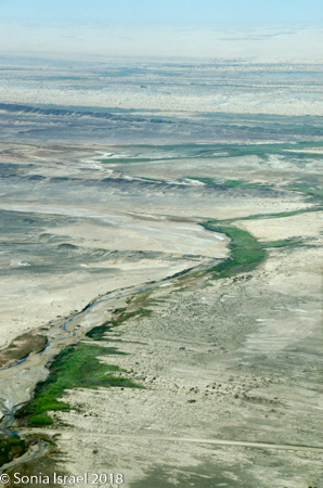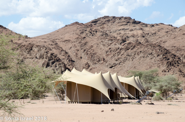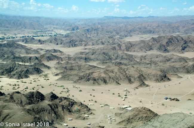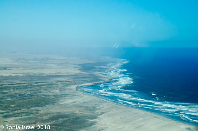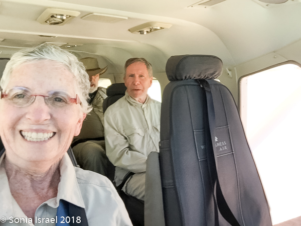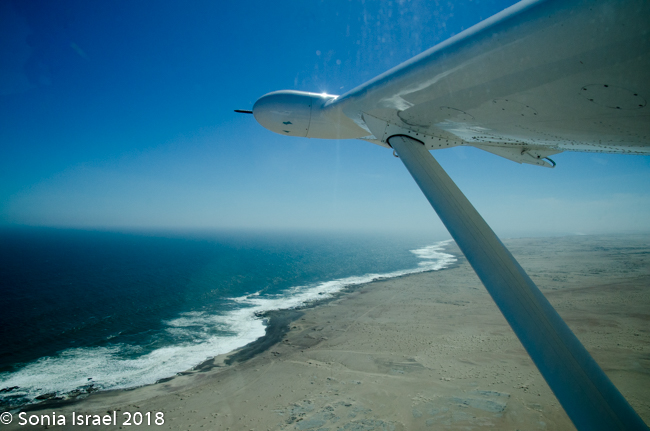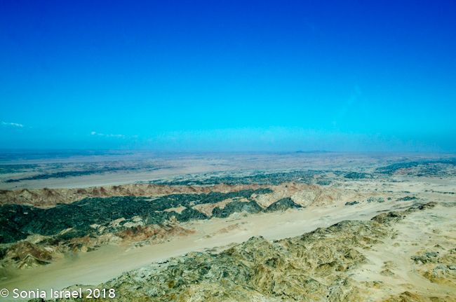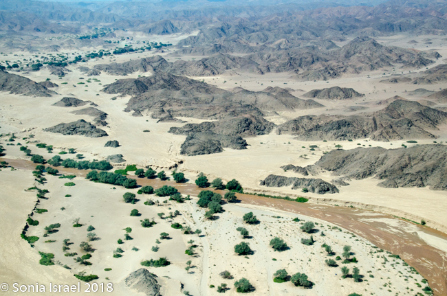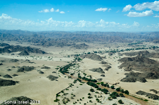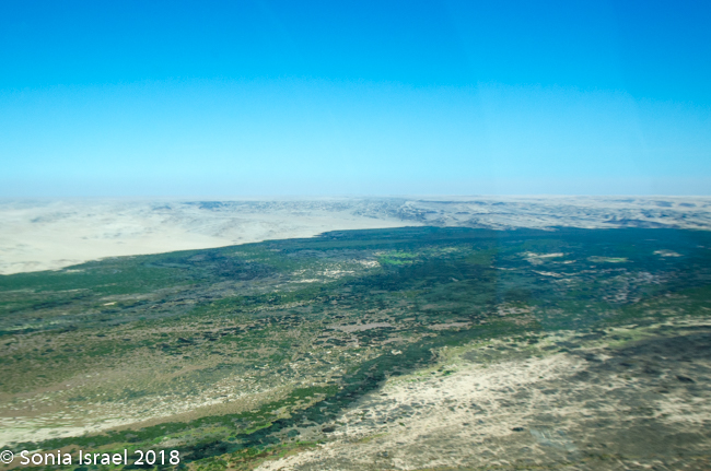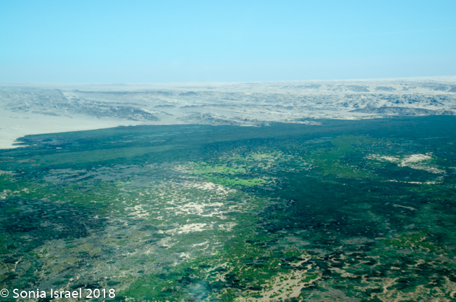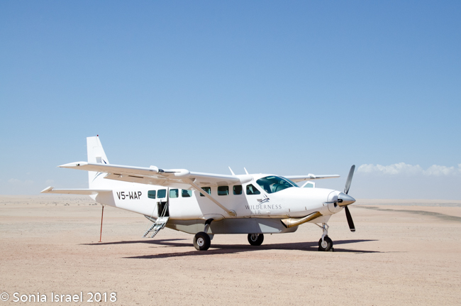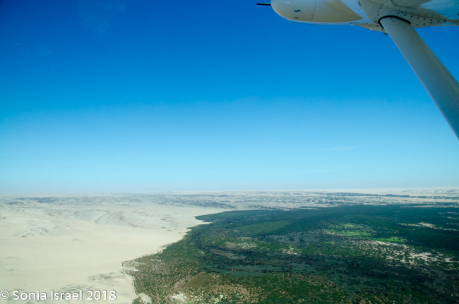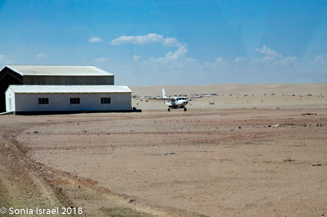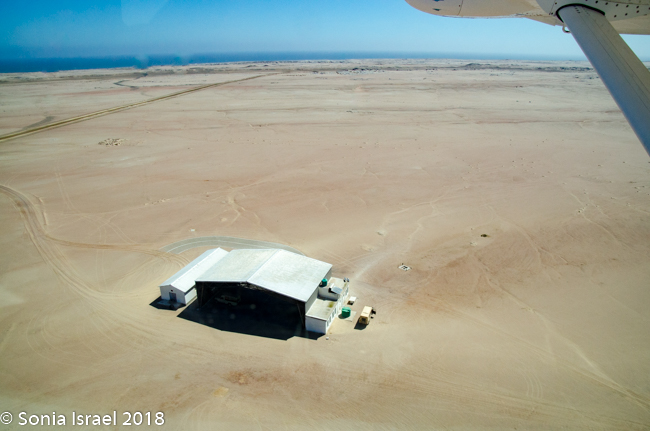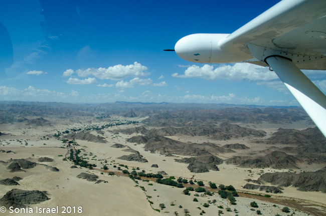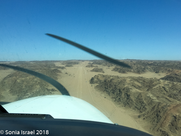 And then it was time to gather our bags and head for back to the airstrip for our bush plane flight to our next destination, Hoanib River. We boarded the small plane and I got to sit next to the pilot. We started by flying west to the coast, and then south along the water’s edge. After a bit, Steven, the pilot, headed east and then north. We flew over the dunes. We flew over the area that had been flooded and that resulted in the flooded roads that caused us to fly. We flew over a the oasis we had visited just a few hours before and over a second smaller oasis, known as Charlie’s Oasis. Yes, after our Charles. And then we could see the lodge, the Hoanib Skeleton Coast Camp, and the small airstrip where we landed a few minutes later.  Somewhere out there we would be camping for the next two nights.