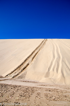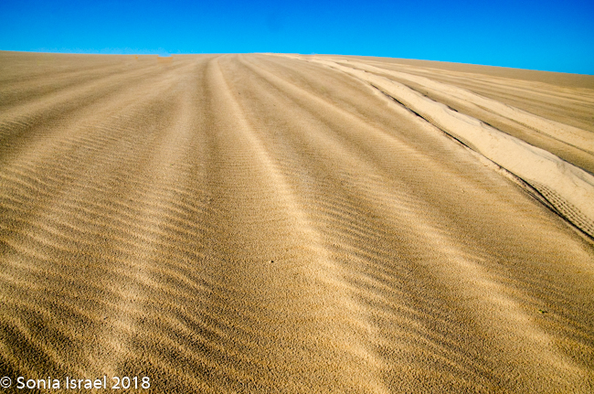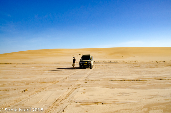 We drove on “Charlie’s Road” as it is now called, veered east past the airstrip (in the middle of nowhere) and came face-to-face with a sand dune. Charles deflated the tires and up we went.