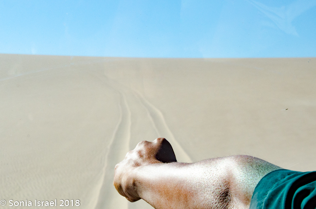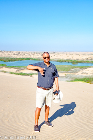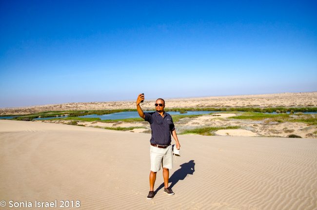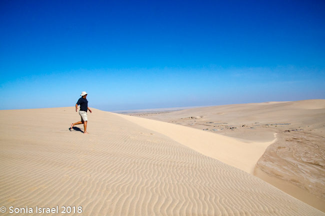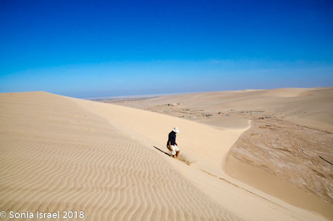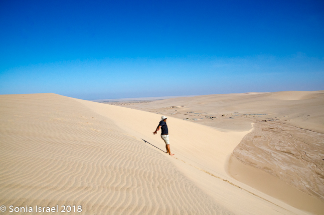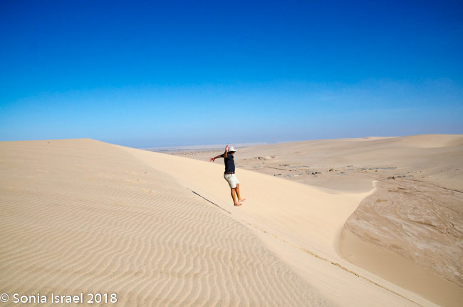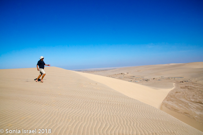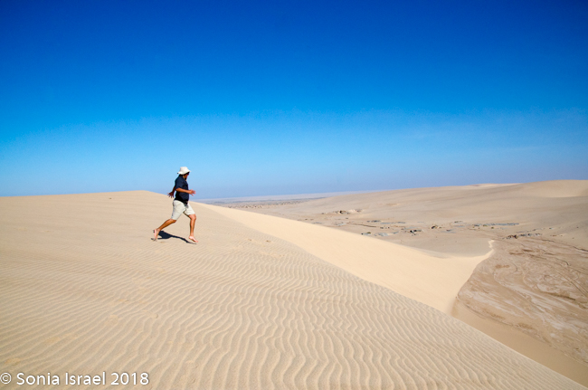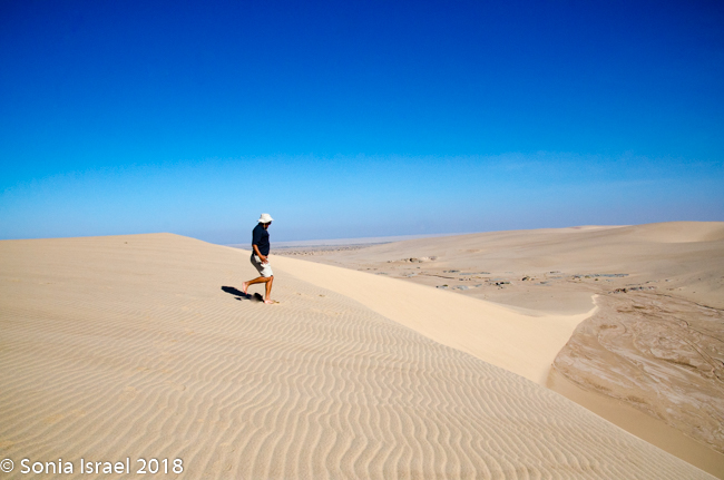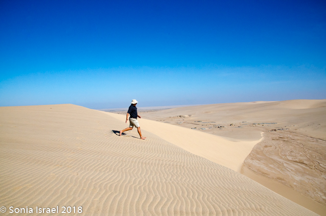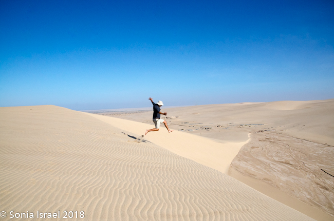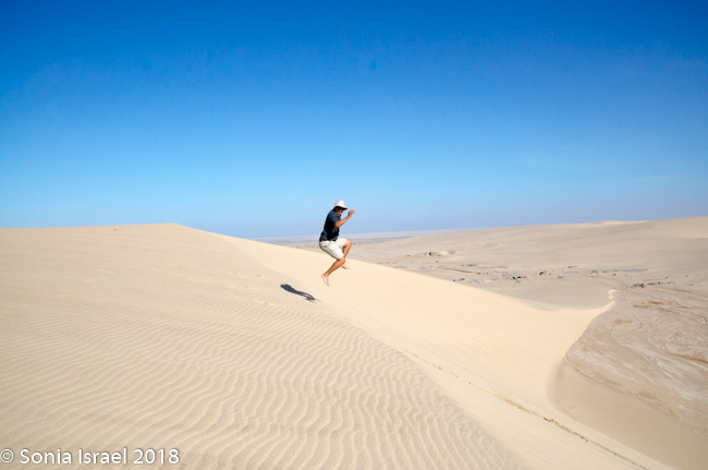 We came off the dune and continued on the riverbed and then went up another, taller dune with a vista of just more dunes everywhere you looked. Charles walked to the edge took off his shoes. posed with his arms out, and before I knew it, jumped