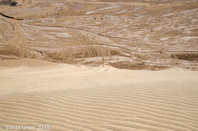 We came over a small hill and now there were some green saltbushes (official name ganna, the same family as beetroot and spinach) on the sand mounds with white dunes up ahead. White dunes growing out of a black base of gravel.  The saltbush is resistant to saline and thus can grow here. Its stems and leaves were a dull and light-green to greyish and the leaves were tightly grouped on the stems and shoots, giving a knobbly appearance.