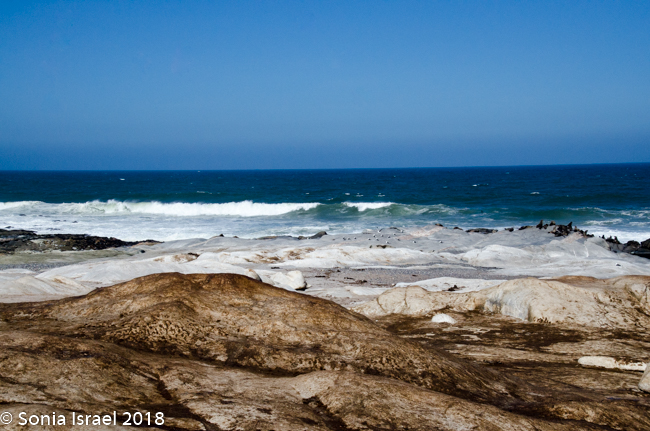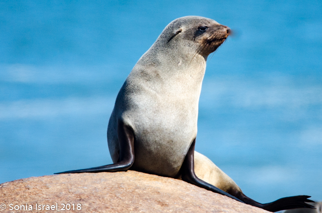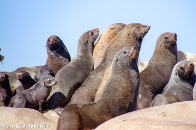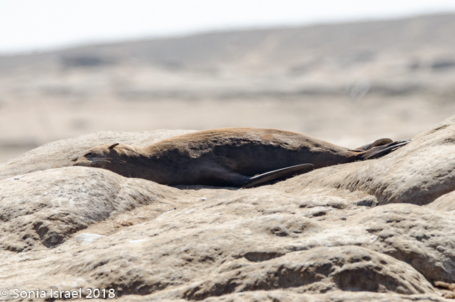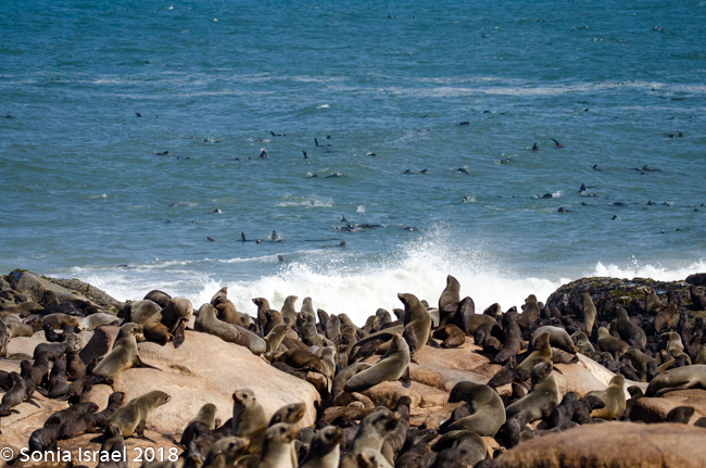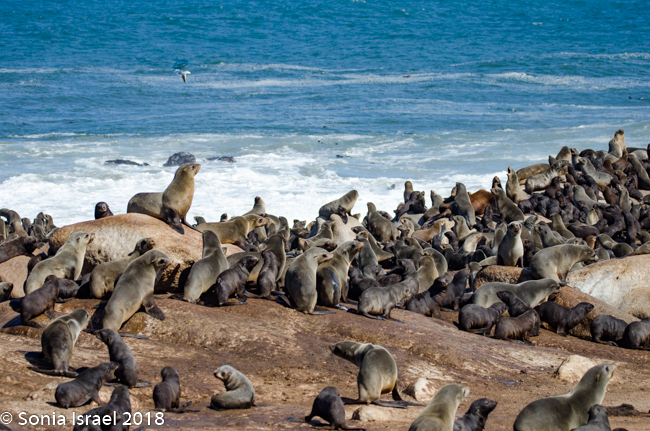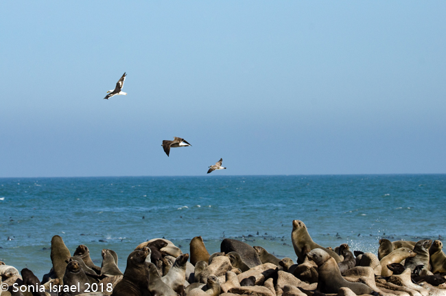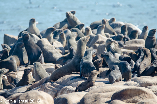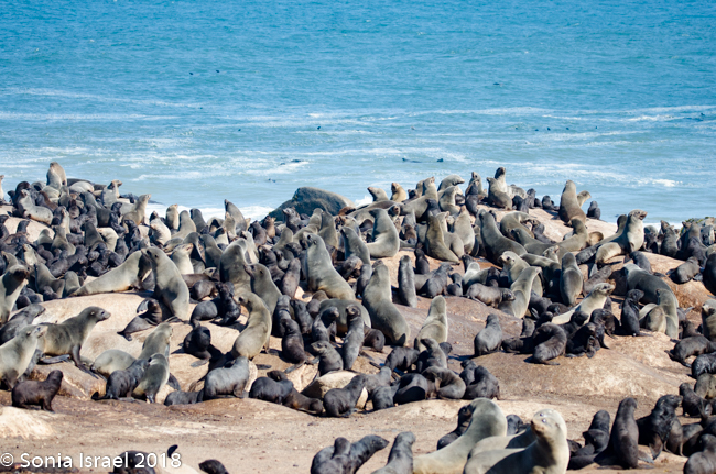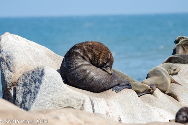 We drove back past the airstrip towards the water’s edge again. Our next stop was at the coastline to view the Cape Fur Seals, whose closest relatives, surprisingly, are brown bears. There are about 2 million seals here as they have no predator here (there are no white sharks here). So the Namibian government culls the seals twice a year. The only other country in the world to cull seals is Canada. It is only the males and the cubs that are culled. The females are always pregnant, so they are never culled. Always pregnant? Their gestation period is 8 months. The males are usually gone for 8 months at a time searching for food. So they implant an egg but fertilization is delayed for up to three month. Thus, she is always pregnant.