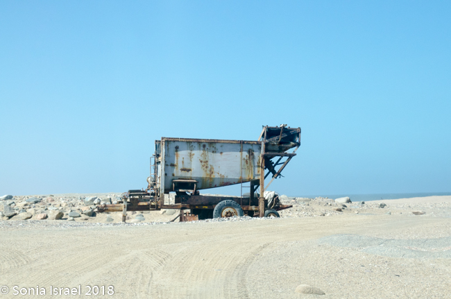 Low mountains appeared on the east. There was no longer sand beneath us. The road and the area around us looked like it now had little black rocks in it, like gravel. In fact these were washed down from those low black mountains. And the road was covered in red dirt. We passed one mine after another. But none seemed to be operating. The roads were desolate. There were no birds except for one lost gull. Desolate. Isolated. Bleak. Stark. Yet beautiful.