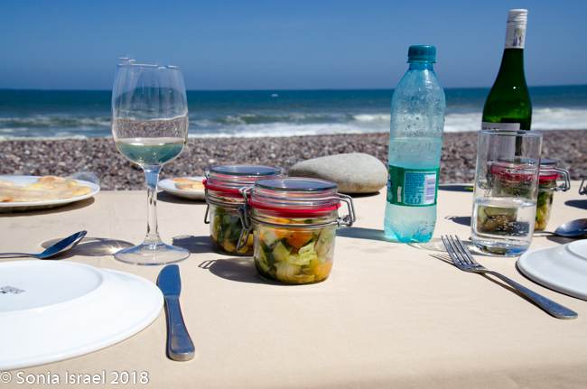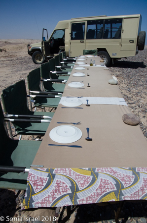 A picnic lunch was then served along the water’s edge. Other clients from the Hoanib Skeleton Coast Camp had flown in to also see the seals and the dunes. We all sat down at a long table with a white table cloth, all seats facing the water. There was a sink set up for us to wash our hands. Wine and beer were offered. And lunch of veggie or beef wrapped in a tortilla, green salad and tuna salad served in jars and fruit for dessert.