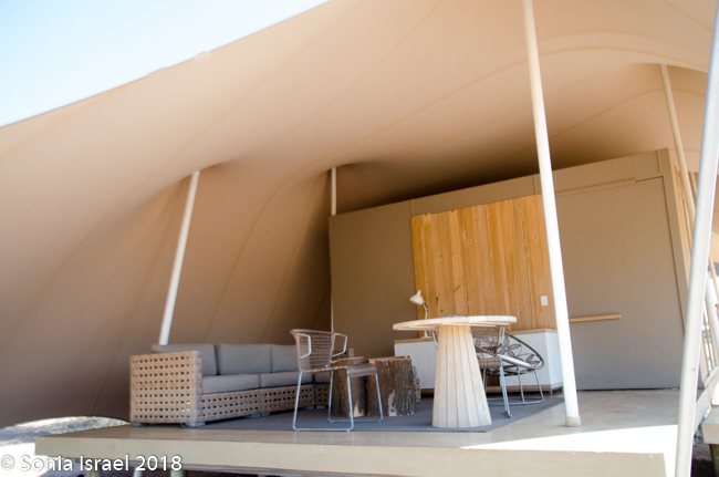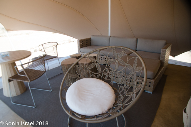 We were met by Gerhard, our guide and cook, no, not cook but rather our chef for the next two days. And now our friend. Gerhard was ready to start the drive to the campsite, but we requested to see the Hoanib Skeleton Coast Camp first. We were greeted by a cold, wet towel to freshen up, and a delicious glass of homemade refreshing sparkling lemonade. One tent was empty as they guests had not yet arrived, so Gerhard took us on tour. We sat in the common area for a bit relaxing.
