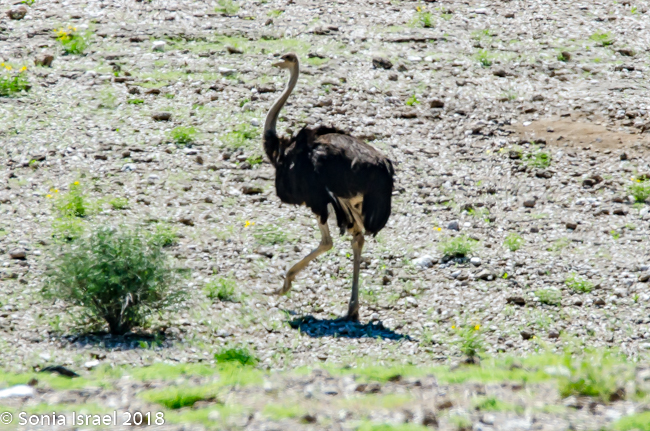 We passed a whole family of ostriches. There was a male ostrich (father?), a female ostrich (mother?0 and 5 babies, toddling along next to them.  I had never seen baby ostriches before. So cute! But don’t get too close…