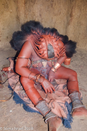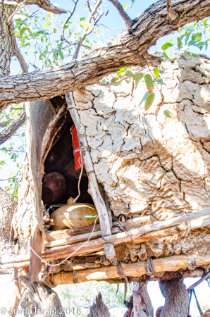 The Himba believe in a supreme being, Mukuru, and in the holy fire, okuruwo (like the Herero). The fire is they way the communicate with Mukuru. It is kept lit continuously and is the bridge between the living and the dead, a way for the village chief to communicate with their ancestors. The doorways in the  houses all face away from the holy fire, with the exception of the chief’s house, which is lit by the sacred glow both day and night, assuring his link to the other side is never interrupted.